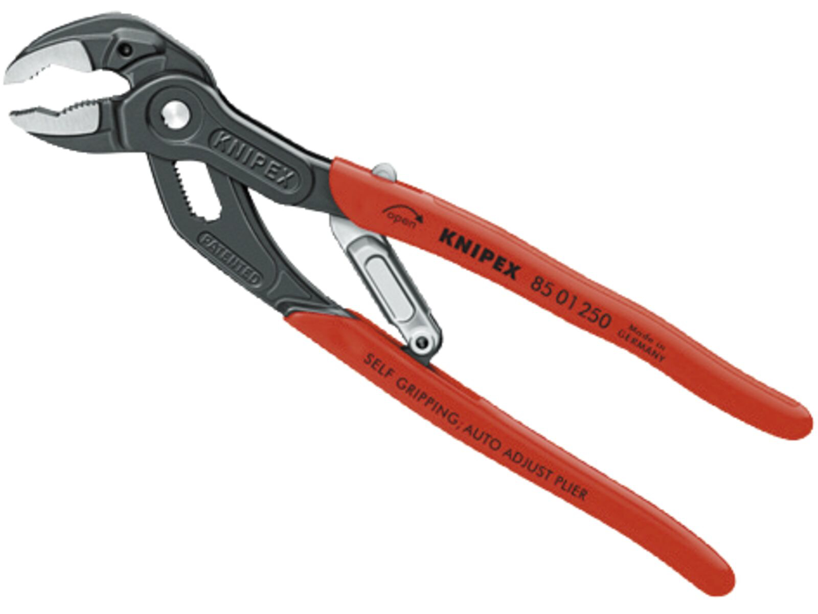 KNIPEX SmartGrip grå atramenteret 250 mm. Optimal til hyppigt at gribe omkring forskellige arbejdsemner. Automatisk indstilling med enhåndsbetjening til højre- og venstrehåndede. God adgang til arbejdsemnet pga. særdeles slank form i hoved- og ledområdet og plan ledbolt. Selvklemmende på rør og møtrikker glider ikke på arbejdsemnet, sparer kraft ved arbejdet. Gribeflader med specialhærdede tænder, tændernes hårdhed ca. 61 HRC. Vedvarende sikkert greb pga. høj slidstyrke. Gennemstukket led i høj stabilitet pga. dobbelt føring. Klembeskyttelse forhindrer sammenklemningskvæstelser. Låsearmen muliggør en pladsbesparende transport med sikkert lukkede greb. Krom-Vanadium-elektrostål, smedet og oliehærdet.