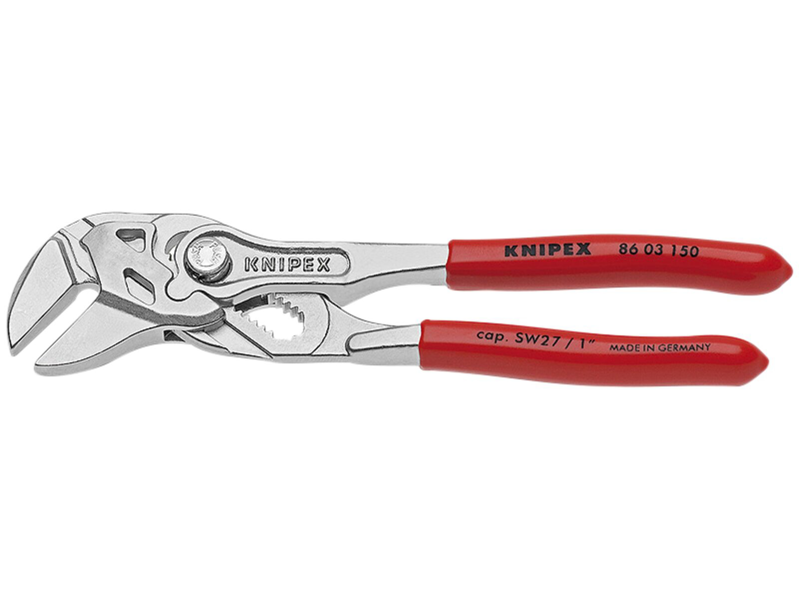 Mini-tangnøgle forniklet 150 mm. Indstilleligt skrueværktøj. Egner sig fremragende til at gribe, holde, presse og bøje arbejdsemner. Erstatter et helt sæt skruenøgler, metrisk og tommer. Glatte kæber for en skånende montering af overfladeforædlede armaturer. Ingen beskadigelse af kanterne ved sarte armaturer pga. spillerumsfri påsætning over hele fladen. Indstilling ved tryk på en knap direkte ved arbejdsemnet. Trinløs gribning af alle nøglevidder op til den angivne kapacitet vha. parallelt førte kæber. Ledbolten går sikkert i indgreb, og dermed ingen utilsigtet ændring af indstillingen. Indbygget skraldefunktion for hurtig spænde og løsne opgaver, uden at fjerne den fra emnet. Høj klemmekraft pga. 10-dobbelt håndkraftforstærkning. Krom-Vanadium-elektrostål, smedet og oliehærdet.