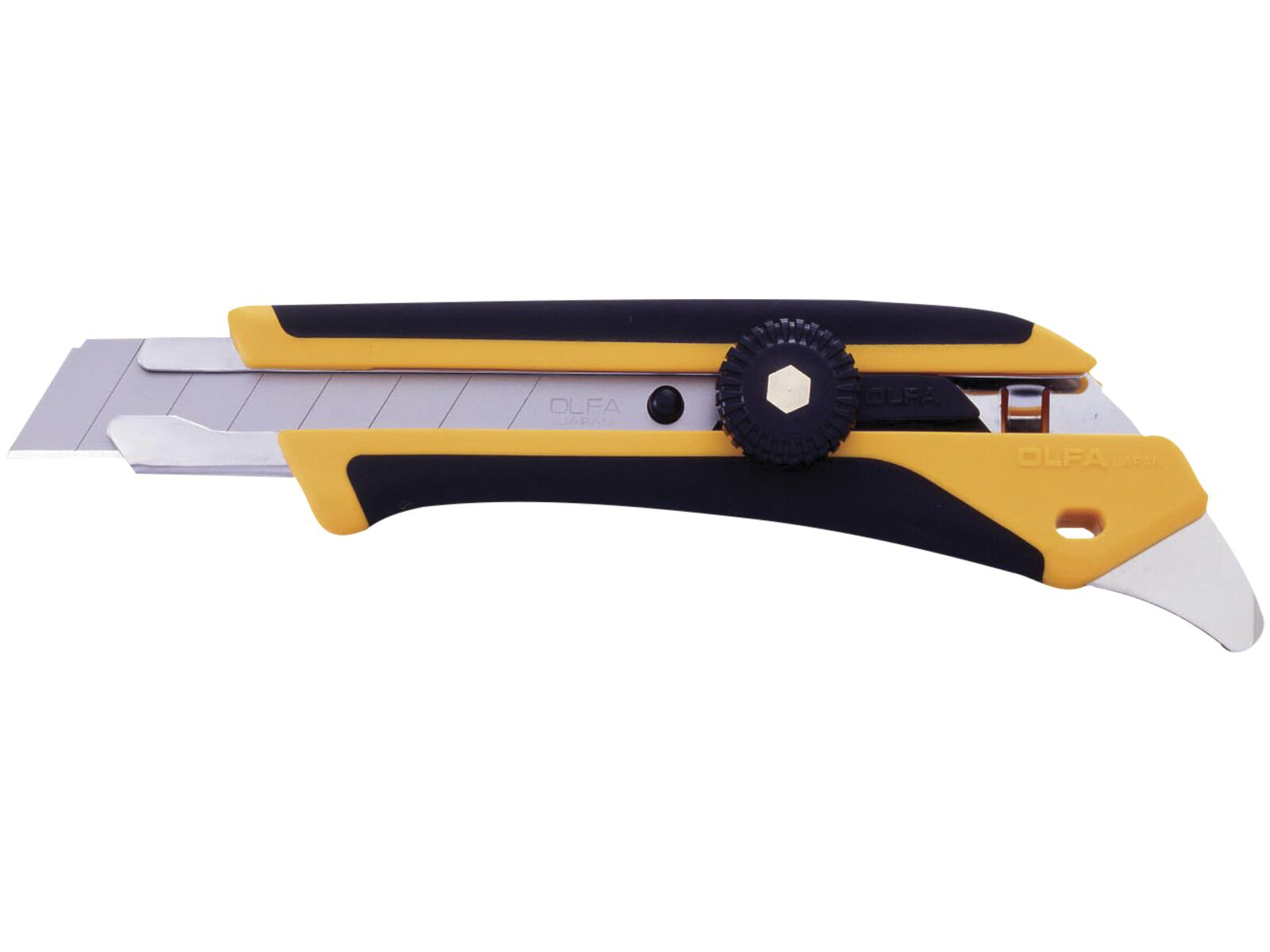 Olfa model L-5 18 mm Bræk-af kniv forstærket ved knivbladet, tæppehage bagest. Med skruelås, gummigreb. Ergonomisk greb Knivblade LB/LBB
