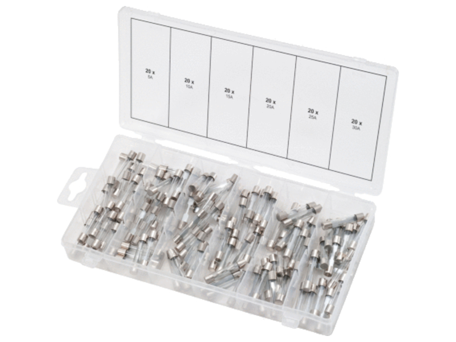 Sortiment af glassikringer 5-30A, 120 dele