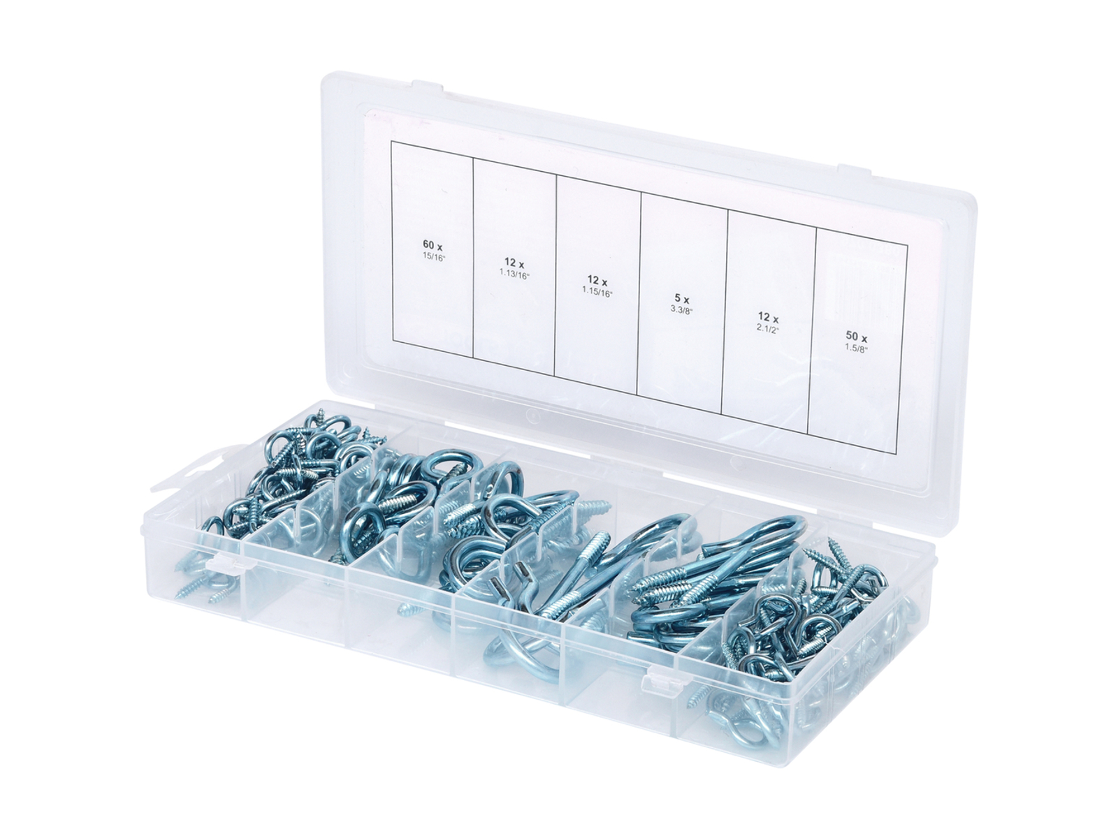 Sortiment af krog- og øjeskruer, 151 dele