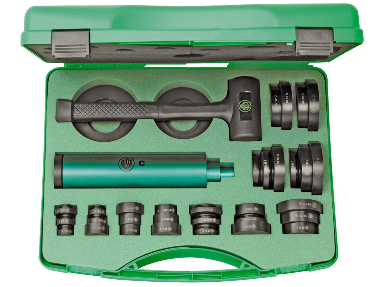 Kukko lejemonteringssæt leveres med monteringsringe med indvendig diamater på Ø10-50 mm. Udvendig diamater på 26-110 mm. Leveres i robust transportkuffert.