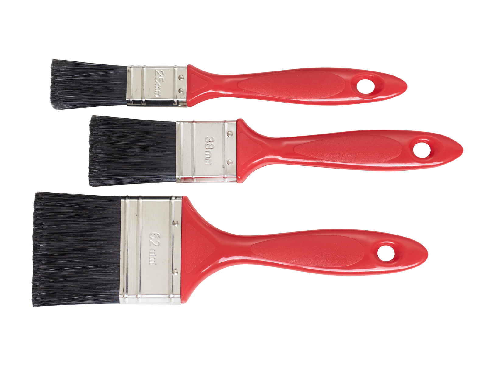 Sæt: 3 flade pensler. Til vandbaserede malinger. Indendørs brug. Syntet børster og plast skafter.