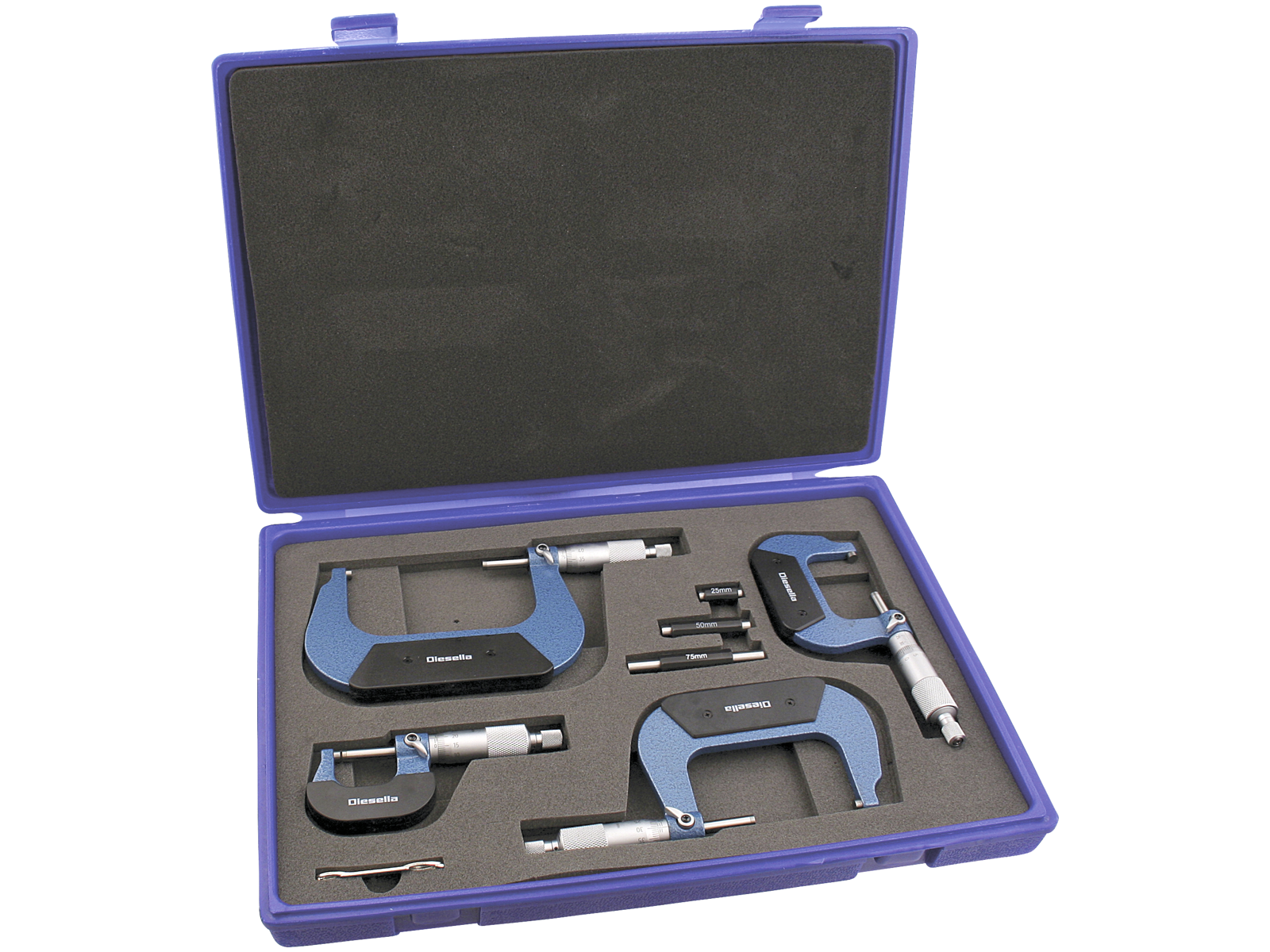 Mikrometerskruesæt med 4 dele. Mikrometerskruer med isoleret bøjle - kontrolmål medfølger fra 25 mm. I matforkromet udførsel med hårdmetal måleflader. DIN 863 standard. Leveres i opbevaringskuffert.