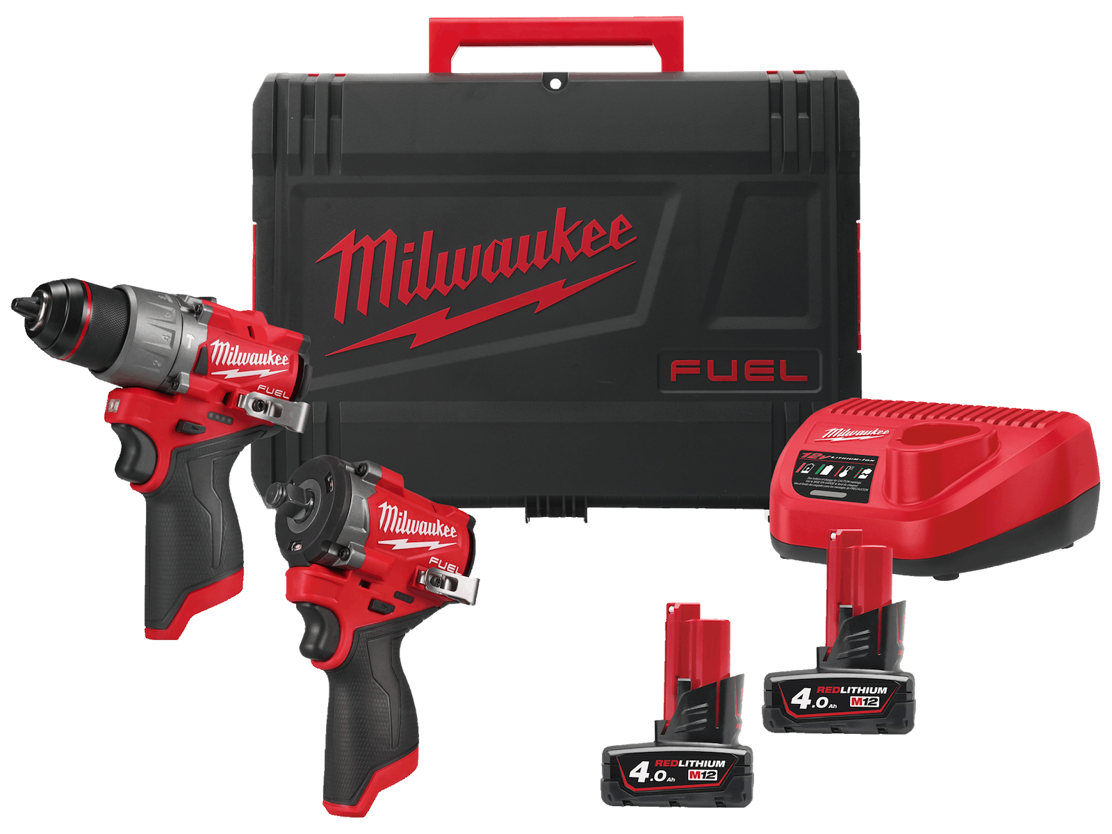 M12 PowerPack maskinsæt med: M12 FPD2 kompakt Fuel slagboremaskine og M12 1/2" kompakt Fuel slagnøgle med friktionsring. Leveres med 2× 4,0 Ah Redlithium-batterier og én 80 min. C12 C lader i HD-boks.