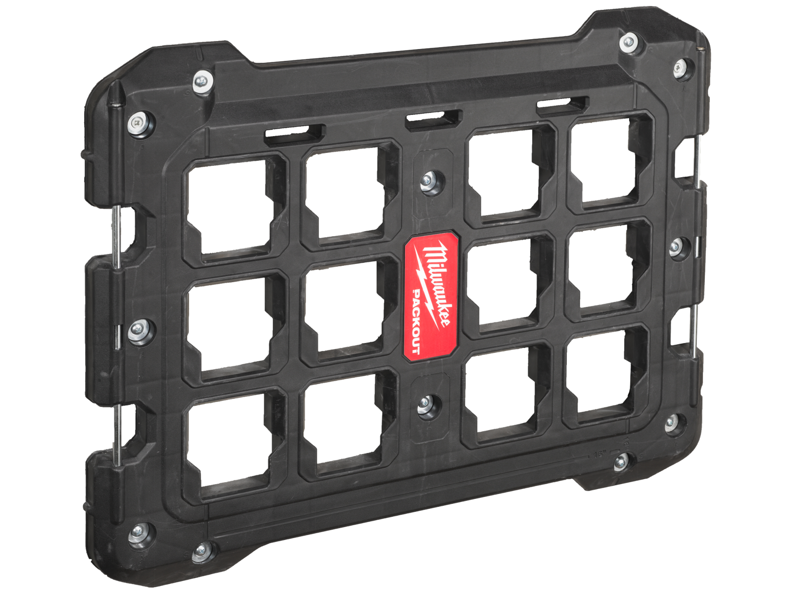 Adskillige monteringsmuligheder. Brug også Packout stationær opbevaring. 45 kg gulvmonteret kapacitet og 22 kg vægmonteret kapacitet. Kan kobles på alle Packout enheder. Slagfast polymer-konstruktion.