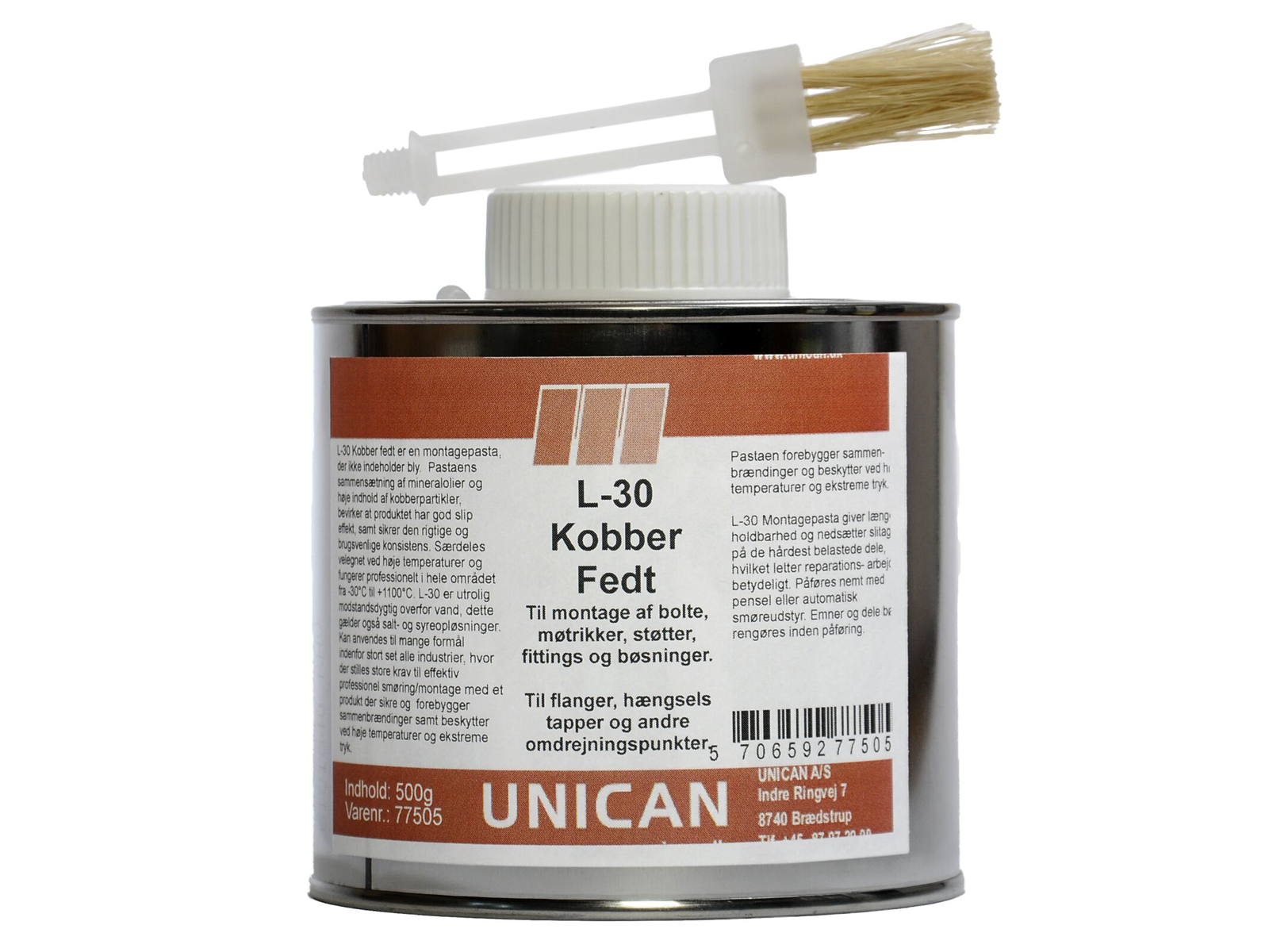 L-30 kobberfedt anvendes til reparations- og montagearbejde alle steder, hvor der samles gevindforbindelser. Produktet forhindrer rivning af gevind ved høje belastninger og virker samtidig fremragende mod fastbrænding i stærkt korrosive miljøer. L-30 løser effektivt montageopgaver i meget ekstreme temperaturområder og klarer uden problemer temperaturer helt op til 1100°C. Ved montageopgaver sprayes L-30 på bolt og møtrik, derefter kan møtrikken spændes uden risiko for rivning, samtidig virker L-30 som en formidabel beskyttelse og forhindrer møtrikken i at rive gevind og senere mod at ruste fast. Dette gør naturligvis reparations- og montagearbejde noget lettere, da man undgår fastlåste samlinger. Den specielle sammensætning af højtryksolier og fine kobberpartikler giver L-30 kobberfedt nogle fremragende kvaliteter, der gør den enestående i smøresituationer med høje belastninger og temperaturer. L-30 kobberfedt kan anvendes indenfor et temperaturområde fra -30°C til +1100°C.