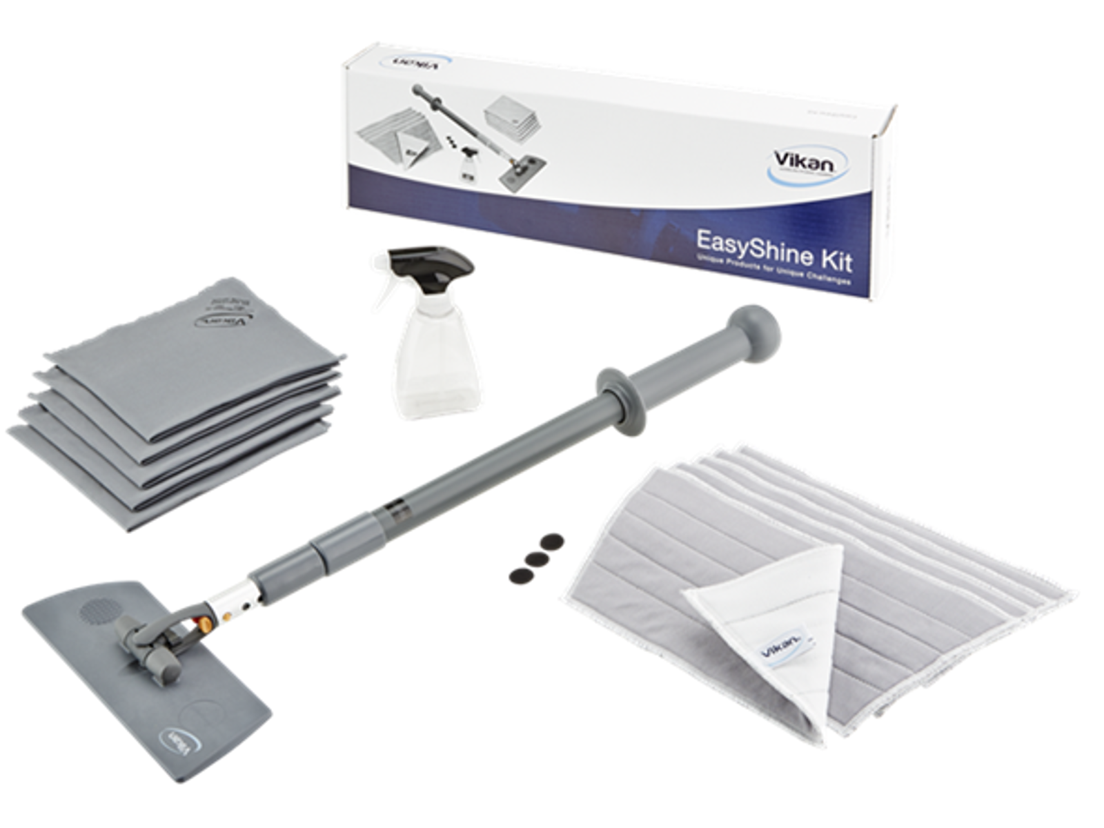 Vikan Easy Shine Kit med fleksibel moppefremfører er en komplet løsning til rengøring af vinduer, spejle, fliser, rustfrit stål, whiteboards og andre højglanspolerede overflader, herunder buede flader som svingdøre, badekar, jacuzzier, buede plastiksæder og bilruder. Sættet indeholder 5 vinduesmopper (549125), 5 klude (691540), 1 sprayflaske (581210), 1 Ultra Flex-moppefremfører (374118) og 1 teleskopskaft (295610).