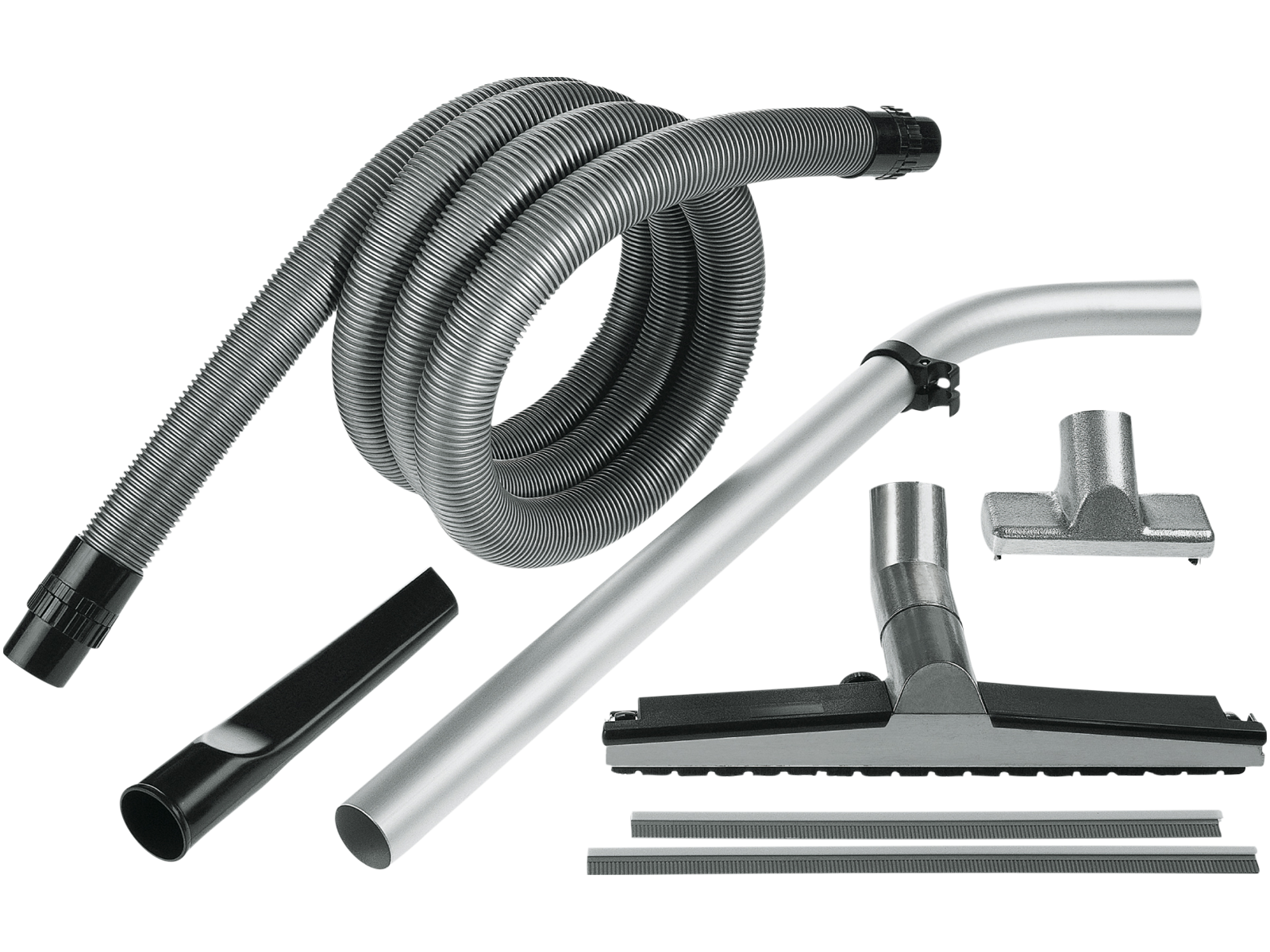Industrisæt til støvsuger. Sættet består af 6 dele (ø50 mm): 4 mtr. universal-sugeslange, 1 mtr. forlængerrør eloxeret, aluminium, 50 mm bredt gulvmundstykke i aluminium til tørsugning, ekstra læber til vådsugning, fugemundstykke i slagfast plast og aluminiums-børstemundstykke til grovsugning.