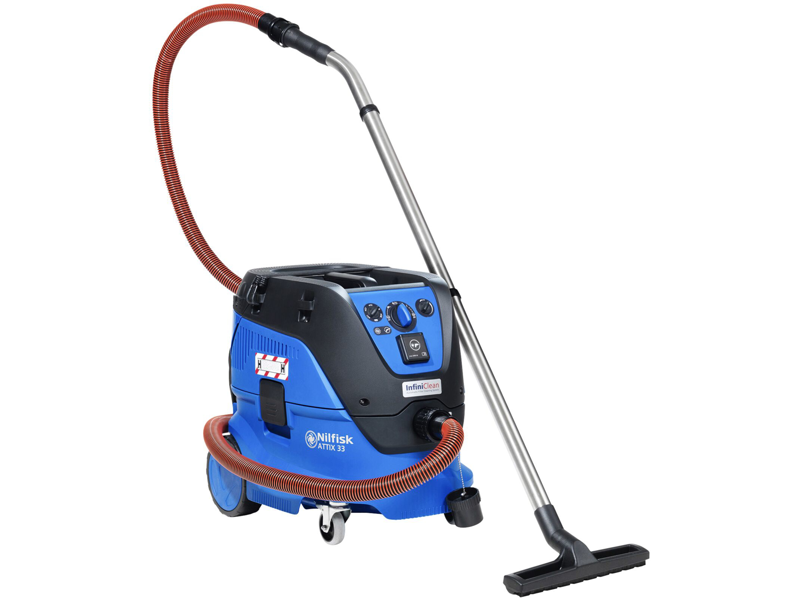 ATTIX 33 serien er udviklet og konstrueret, så de har endnu højere effektivitet, øget produktivitet og lavere vedligeholdelsesomkostninger. ATTIX 33 våd-/tørsugerne er robuste og nemme at håndtere - også ved transport fra sted til sted. Alle modellerne har fleksible opbevaringsløsninger til værktøj og tilbehør. ATTIX 33 serien leveres i forskellige modeller til at opfylde alle sikkerhedsklasser (L-M-H). De nye våd-/tørsugere i ATTIX 33 M-H serien er konstrueret og designet med fagfolk i tankerne. Våd-/tørsugernes sugestyrke er meget høj i kraft af nyudviklet konstruktion. Det betyder forøget ydeevne samt forbedret lufthastighed i slange, mundstykke og værktøjskobling. Resultatet er eminent opsamling af støvpartikler og produktivitet. Nilfisk InfiniClean™ systemet renser automatisk filteret hvert 15. sekund. ATTIX 33 serien fås i sikkerhedsstøvklasse M og H. Våd-/tørsugerne har en 100 % forseglet luftstrøm selv under filterrensning, så eventuelt farligt støv bliver i maskinen. Leveres med vaskbart PTFE long-life filter og til H-klasse medfølger dobbelt filterløsning med HEPA 13 filter. Fuldautomatisk InfiniClean™ (IC) eller semiautomatisk Push&Clean™ (PC) filterrensesystem. PTFE hovedfilter med 99,9% filtrering. Støvklasse M-H certificeret. 30-liters beholder med drejelige forhjul. Fleksible gummistropper, universalbeslag til værktøjskasse (L-BOXX og TANOS) fås som tilbehør. MultiFit tilbehørssystem giver optimal fleksibilitet.