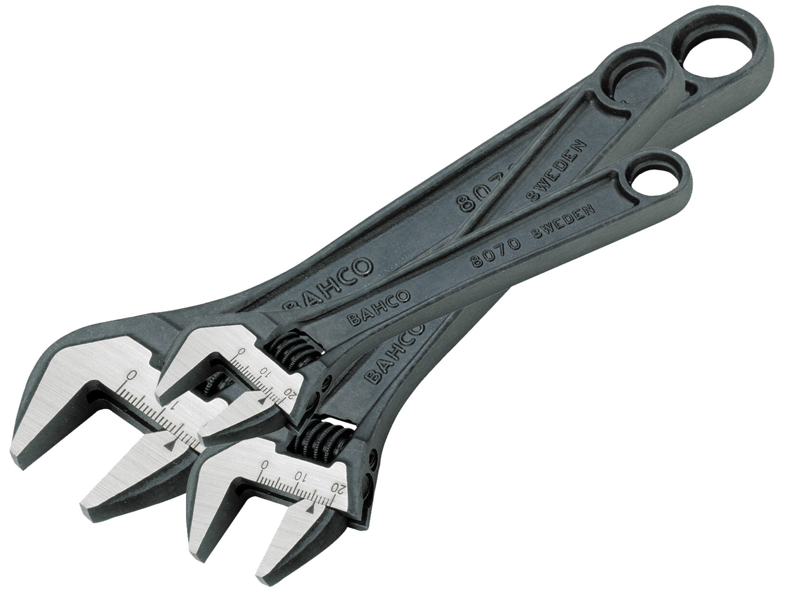 Sæt med 3 Bahco Series 80 justerbare skruenøgler. Nøglerne har fosfat-finish, koniske kæber og målestok på den faste kæbe. Nøglerne har en 15º hovedvinkel uden udragende skaft, når de er fuldt åbne og et stærkt I-sektionshåndtag. Sættet indeholder: 8070: 6"/155mm, 8071: 8"/205mm, 8072: 10"/255mm.