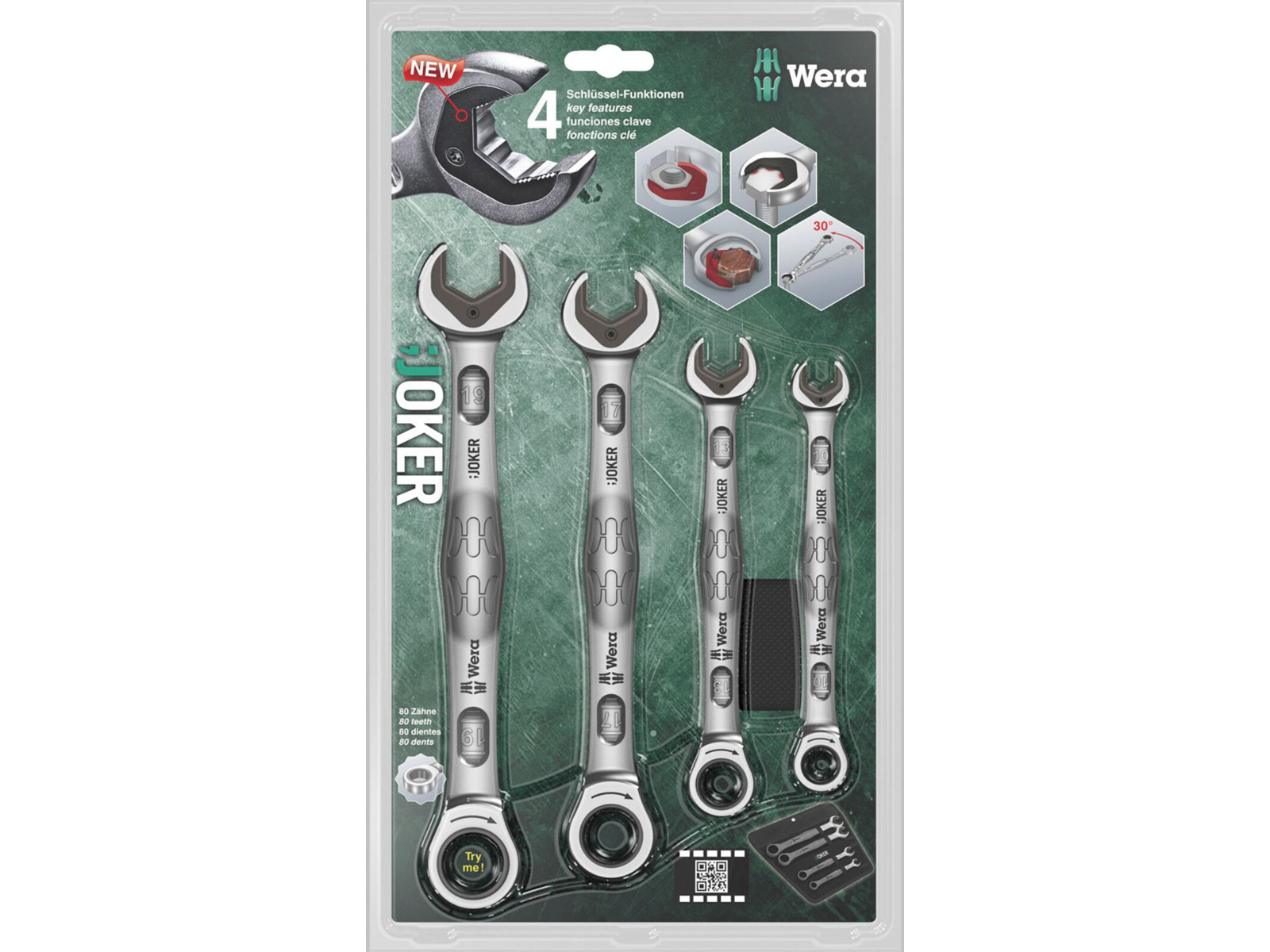 Kvalitets ringskralde-gaffelnøgle-sæt fra Wera: Alt, hvad en nøgle skal kunne. og meget mere til. Hurtigere, bedre, kønnere. Netop en rigtig Joker. Den nye generation af gaffel-ringskralde-nøgler. Sæt i 4 dele i robust taske. Til sekskant-skruehoveder hhv. -møtrikker. Med holdefunktion via metalplade i gaflen, der nedsætter faren for at tabe skruer og møtrikker. Den udskiftelige metalplade i gaflen fastholder med ekstra hårde tænder skruer og møtrikker og nedsætter faren for at rutsje af. Det integrerede slutanslag kan forhindre, at man rutsjer ned fra skruehovedet og muliggør pålægning af større momenter. Den dobbelte sekskantgeometri sørger for en formtilpasset forbindelse med skrue og møtrik og dermed for nedsættelse af faren for at rutsje af. En returvinkel på kun 30° på gaffelsiden hindrer tidskrævende venden nøglen om ved skruning. Skraldemekanik på ringsiden med usædvanlig høj finfortanding på 80 tænder giver fleksibilitet i snævre montagesituationer. Den specielle smedegeometri sørger for stor momentoverførsel og høj bøjningsstyrke. Fremstillet af højtydende krom-molybdæn-stål med nikkel-krom belægning for høj korrosionsbeskyttelse. Med værktøjsfinderen "Take it easy": Farvemærkning efter størrelse.