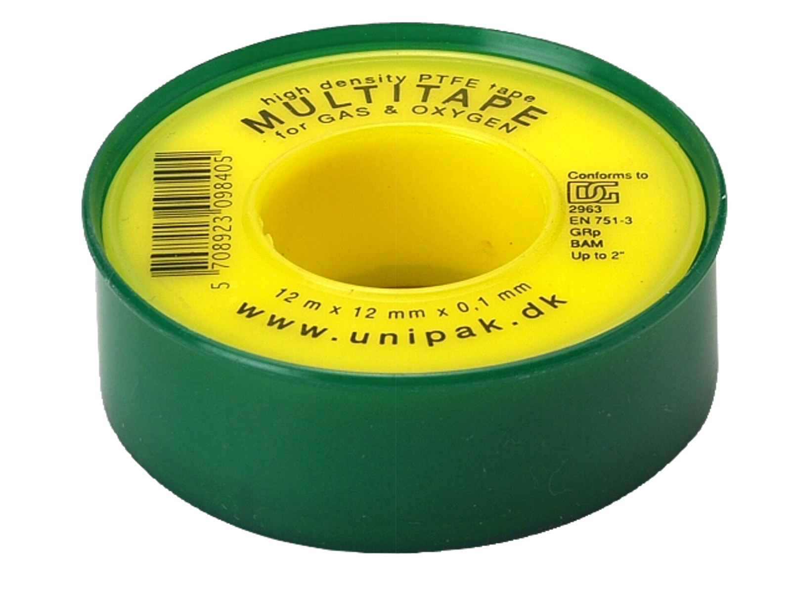 MULTITAPE (12m x 12mm x 0,100mm) Massefylde 1,0g/cm3. Velegnet til damp, kemikalier, syrer, baser, opløsningsmidler m.v.. Godkendt til GAS, drikkevand og ilt. Velegnet til anvendelse i situationer, hvor der stilles store krav til f.eks. swyrebestandighed, tryk eller varme. Produktet er meget diffusionstæt og derfor meget egnet til olie (også hydraulik), benzin og diesel. Kan tilbagejusteres med 45º eller mere. Temperaturbestandig fra -200ºC til +260ºC. Max tryk: 60 bar. Vare nr.: 1000600