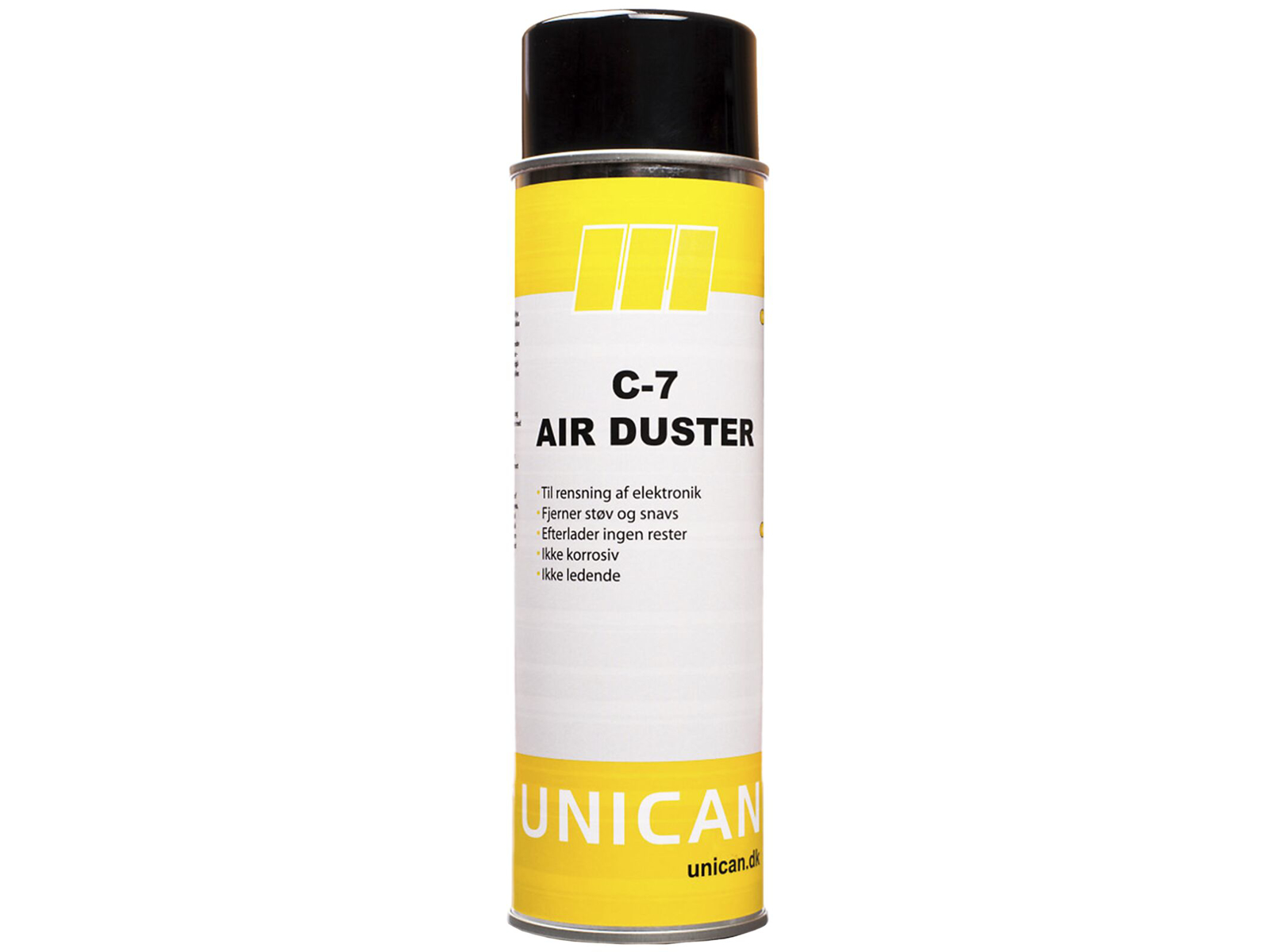 C-7 Air Duster er et produkt, som er specielt udviklet til rengøring af alle former for elektriske komponenter så som printplader, tastaturer, fotoudstyr, optik, kontakter m.m. Produktet fjerner effektivt støv og fremmedlegemer og kan med succes bruges på svært tilgængelige steder. C-7 Air Duster kan med fordel anvendes på alle slags overflader og materialer. C-7 Air Duster skader ikke plastik, glas, lakerede overflader, gummi, metal, stof m.m. Ved anvendelse holdes dåsen lodret. Produktet kan ikke anvendes på hovedet eller i vandret stilling. I det omfang, at et ubrandbart produkt ønskes, kan anbefales Unican C-9 Power Booster.