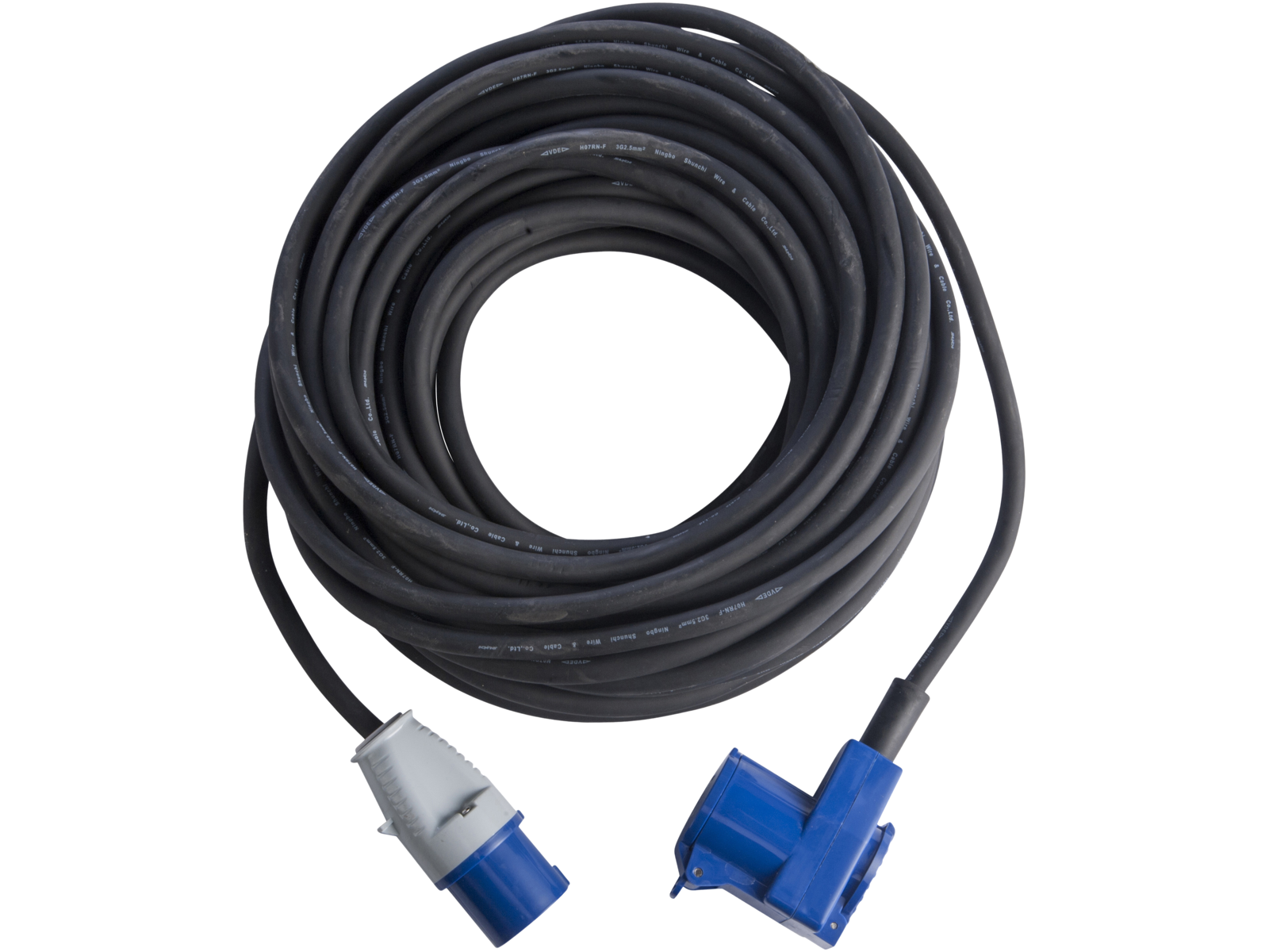 Campingkabelsæt med CEE-han og CEE-hun med Schoku udtag. Med 3×2,5 mm² neopren-gummikabel H07RN-F. 230 V, 16 A. 3.680 W. IP44.