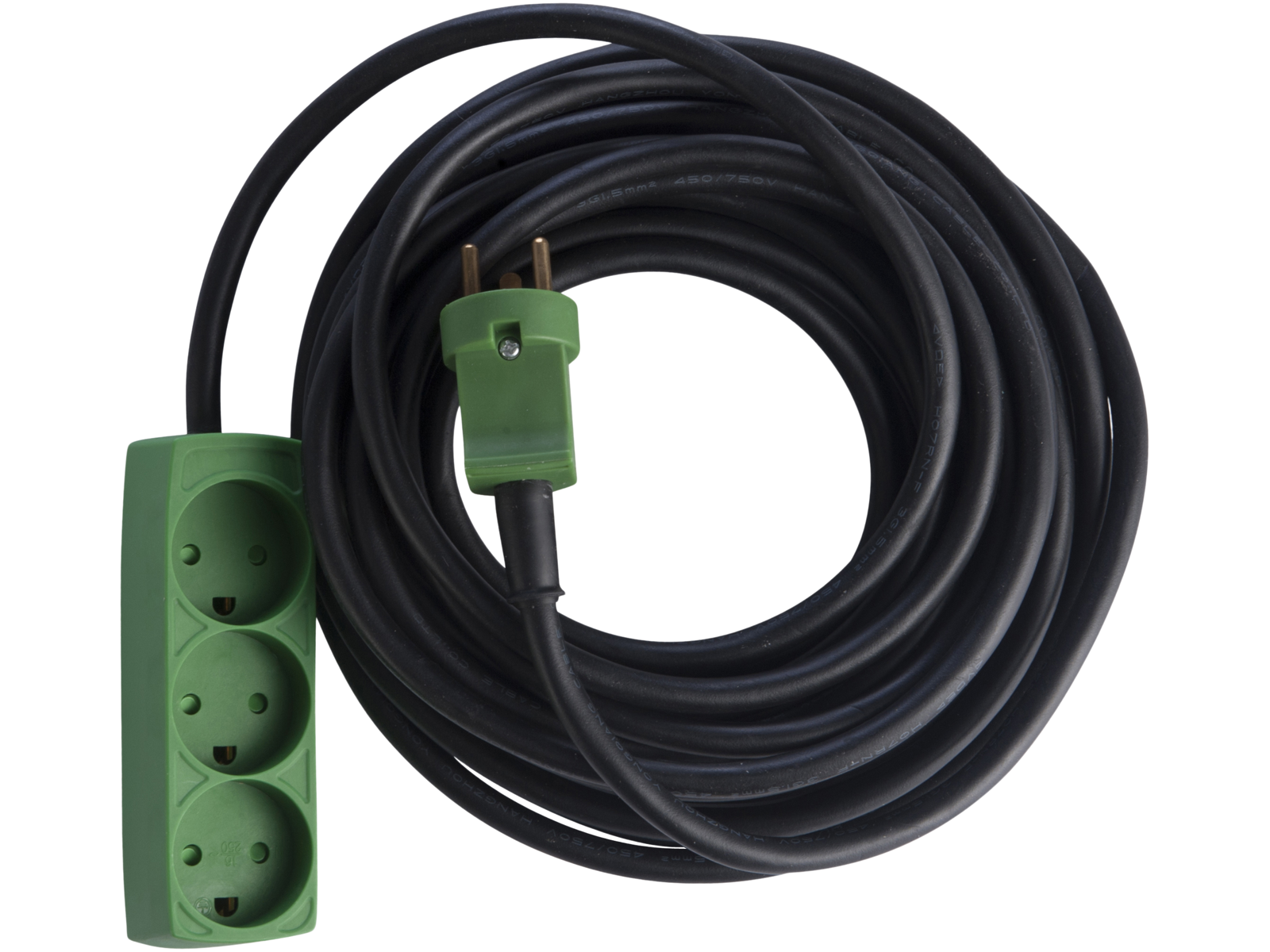Kabelsæt med DK stikprop og 3-vejs stikdåse med jord. Med 3×1,5 mm² neopren-gummikabel H07RN-F. 230 V, 16 A. 3.680 W. IP20. Fås i 3 længder: 10, 15 og 25 mtr.