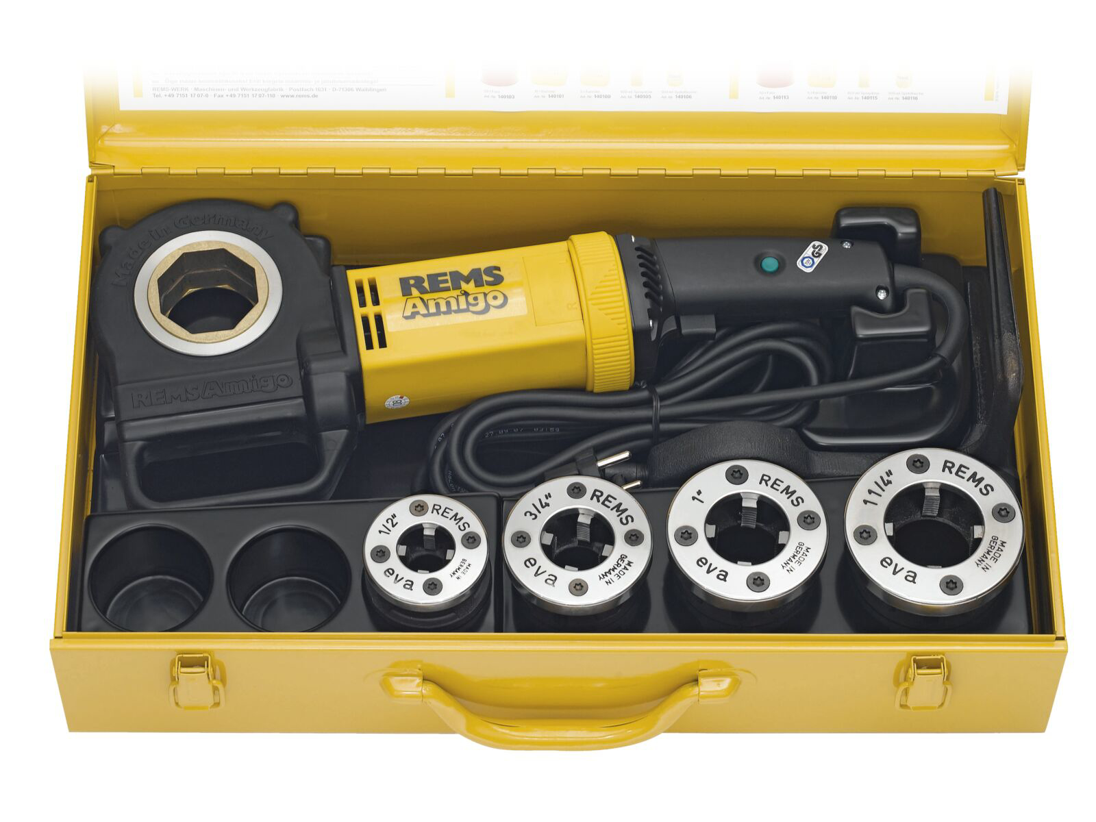 Rems Amigo sæt. Elektrisk gevindskæreklup med lynudskiftelige skærehoveder. Rørgevind 1/8-1.1/4", 16-40 mm, boltegevind 6-30 mm, 1/4-1". Højre- og venstregevind. Maskine med vedligeholdelsesfrit drev, enorm stærk universalmotor 230 V, 50-60 Hz, 1200 W, sikkerhedskontakt. Merydelse ved automatisk kulbørsteregulering ved ændring af drejeretning. Spidsbelastning op til 1800 W, overbelastningssikring. Aflastningsbøjle til begge skæreretninger. Rems EVA lynudskiftelige skærehoveder til konisk rørgevind ISO 7-1, DIN EN10226 (DIN2999, BSPT) R højre, hhv. til gevind på elektroinstallationsrør DIN EN 60423 M. I stabil stålkasse. Sæt med R 1/2 / 3/4 / 1 / 1.1/4".