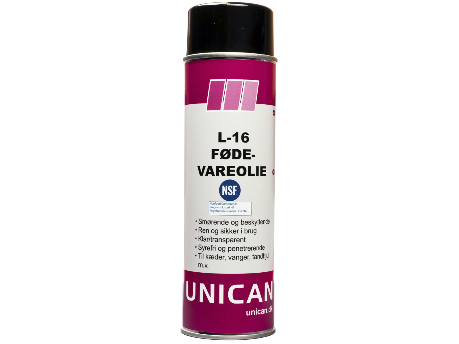 NSF-H1 Godkendt. L-16 Fødevareolie er udviklet specielt til fødevare og medicinalindustrien. Meget velegnet til smøring i industrier, hvor en syrefri transparent oliefilm ønskes. L-16 Fødevareolie dækker et meget bredt behov for smøring. Indenfor levnedsmiddelsektoren, anvendes L-16 til smøring af kæder, tandhjul, aksler, lejer, vanger, transportører, gear, kabler m.m. L-16 Fødevareolie tåler vandafskylning og virker effektivt indenfor et bredt temperaturområde fra -30°C til +180°C. L-16 Fødevareolie efterlader en lugt og smagsfri transparent film, som giver fremragende smørende og korrosionsbeskyttende egenskaber og som i levnedsmiddelindustrien effektivt kan anvendes til at holde diverse rustfri maskiner i perfekt stand.