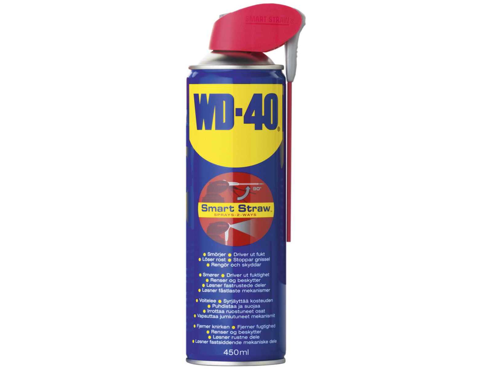 WD-40 Smart-Straw sprøjter dobbelt så godt, takket være det nye klapsystem på sprøjtehovedet. Til punktnøjagtig sprøjtning f.eks. ved brug som kontaktspray eller ved vedligeholdelse af låsecylindre, klapper man bare røret ud i en vinkel på 90°. Til fladedækkende sprøjt, f.eks. ved fælgrensning eller pleje af haveværktøjer, klappes røret ganske enkelt ned igen. Med den nye WD-40 Smart Straw er det slut med at lede efter røret og man kan betjene klapfunktionen med en enkelt håndbevægelse.