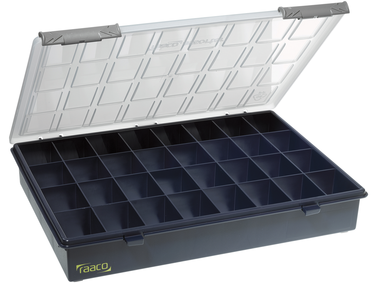 Sortimentsæske med faste rum. Udstyret med U-profiler indvendigt i låget, som sikrer indholdet bliver på plads under transport. Lukkes ved hjælp af skydelåse.