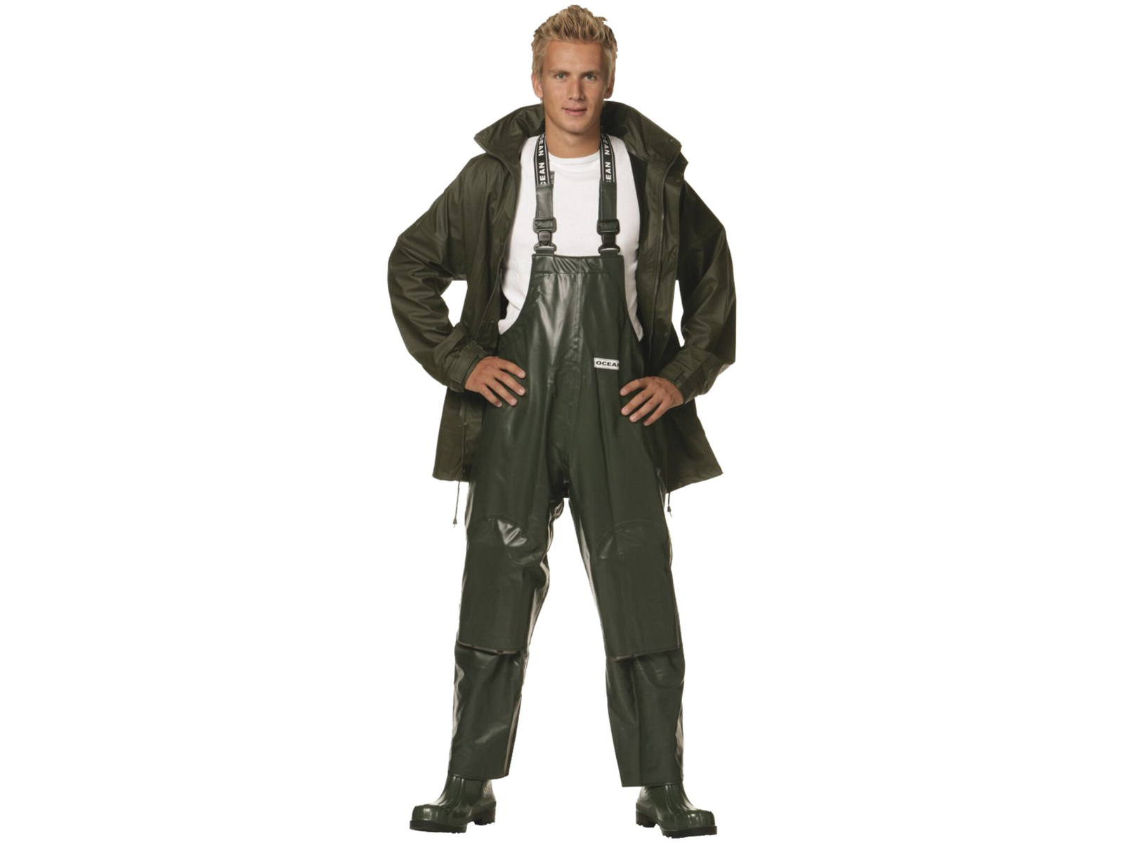 Skovoverall. Dessin 336-131 ( Med knælommer). Dessin 336-13. Materiale:Front: PVC/polyester (325 g). Bag: PU/-nylon (220 g). Vandsøjletryk: 8.000 mm. Størrelser: S-3XL. Ekstrem slidstyrke kombineret med høj. comfort. Overall med elastiske seler og. fixlock lukning. Ekstra forstærkede på knæene og med. lommer for knæpuder. Indvendig lomme. med lynlås. Fås også som buks (dessin 336-121).