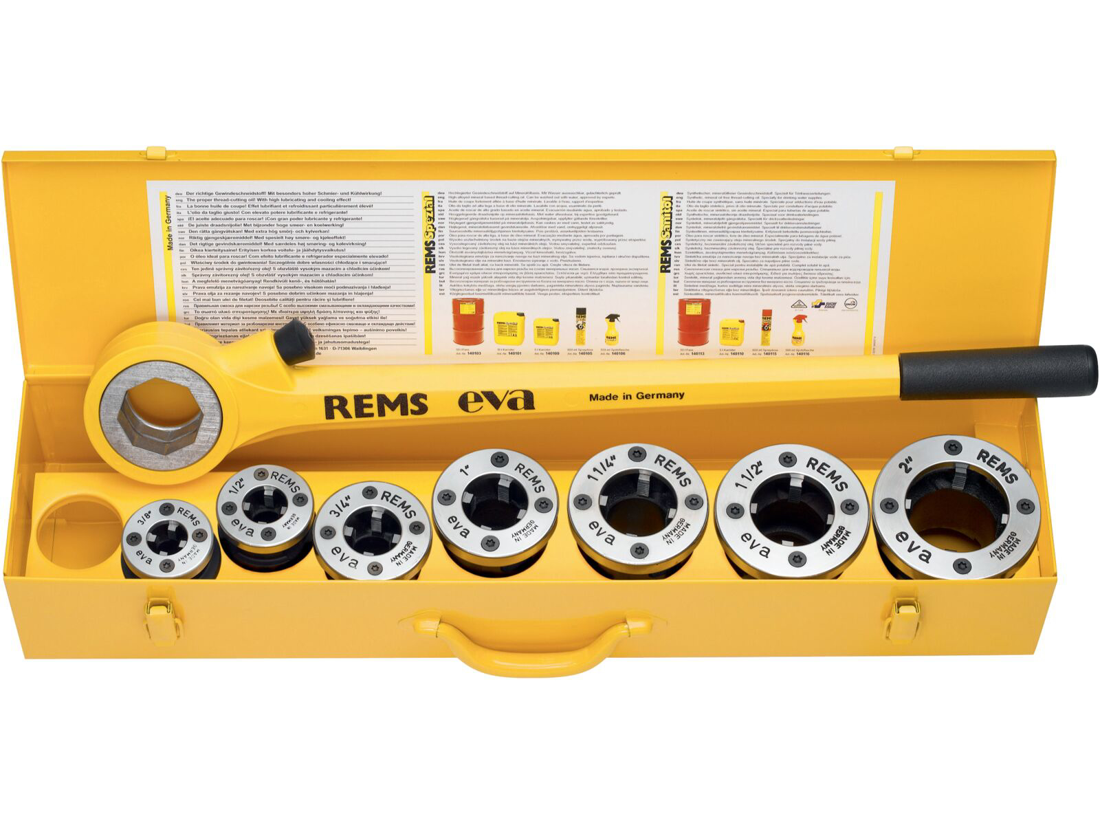 Rems EVA Kluppen til fagfolk. Særlig let påbegyndelse af skæring og gevindskæring. Skralde af stål, beklædt med tykt lag plast. Kun en slags lynudskiftelige skærehoveder. Rems EVA sæt i stålkasse R 1/2 / 3/4 / 1 / 1.1/4 /1.1/2 / 2".
