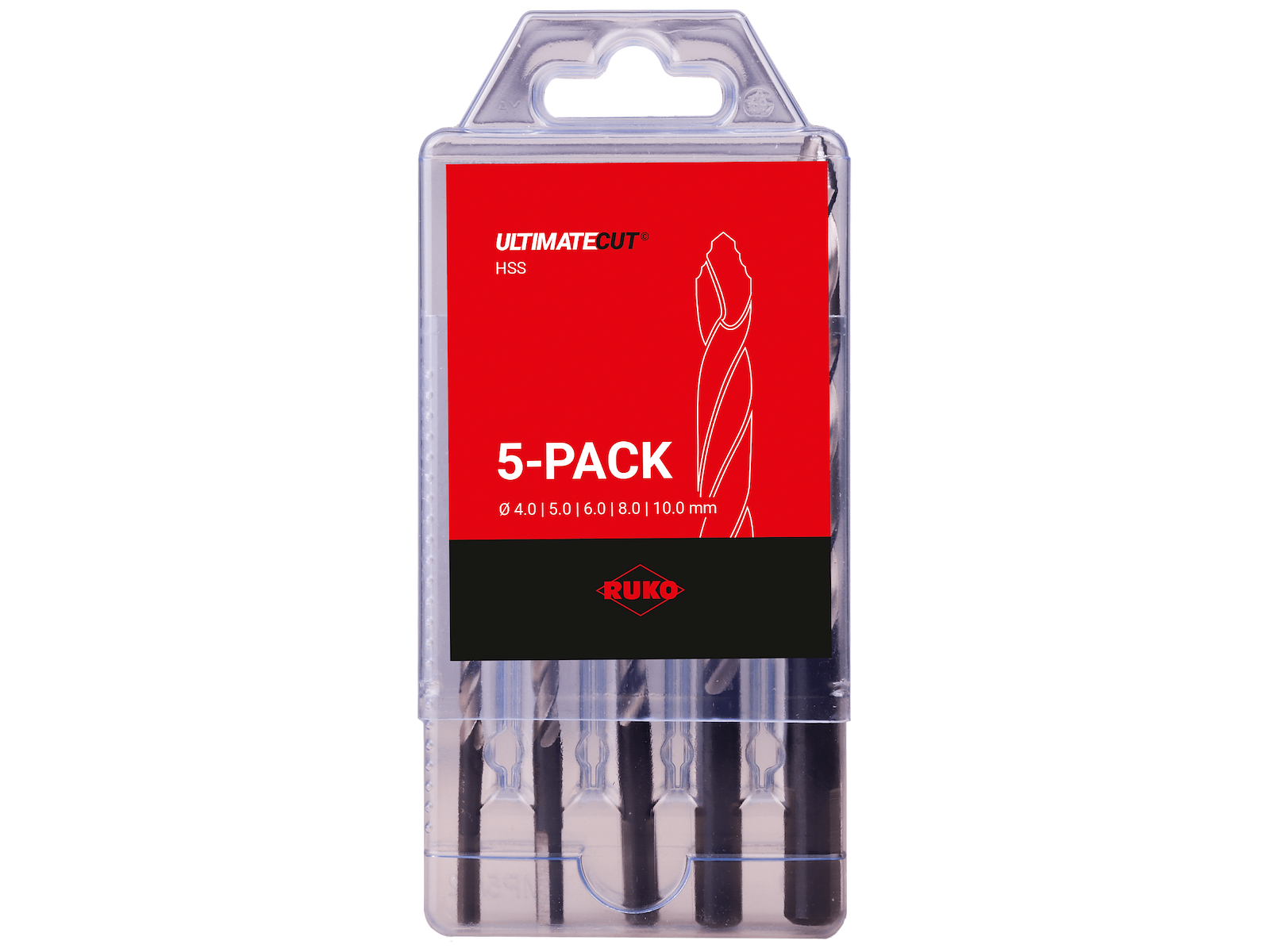 UltimateCut spiralborsæt til boring i de fleste metaller og kunststofmaterialer. Flowstep-spids - borer op til 5× flere huller, dobbelt så hurtig som standardbor. Skaft med 3 spændeflader. Sæt med 5 størrelser: 4,0 / 5,0 / 6,0 / 8,0 / 10,0 mm.