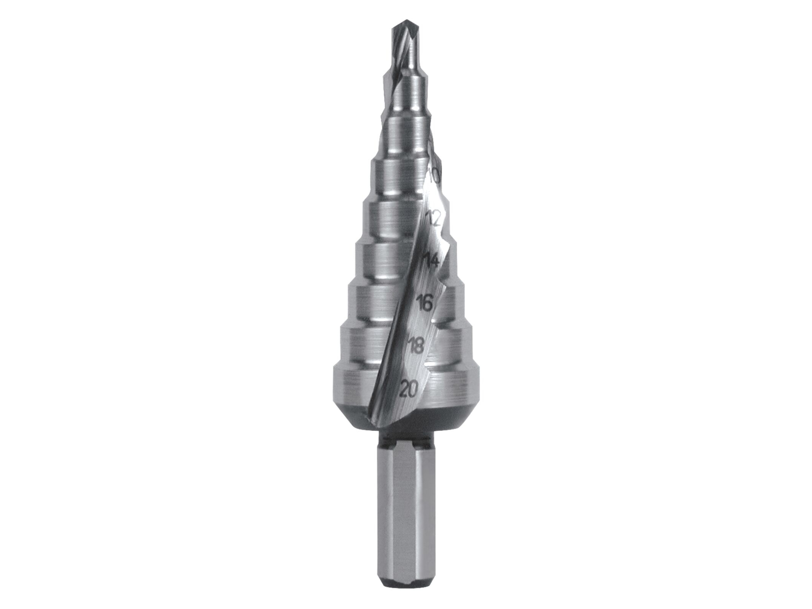 Trappebor HSS 4-20 mm 4-6-8-10-12-14-16-18-20 mm. Den dybslebet og spiralsnoet spånkanal giver et helt roligt løb og samtidig en meget stor skærekapacitet. Især ikke brækkende spåner transporteres meget let væk, akkurat som på et spiralbor. Dette formindsker samtidig at affald og koldsvejsninger sætter sig på skæret. Konusen for enden af trinboret letter tilbagetrækningen ved gennemboring af pladen. Anvendes til stål, støbegods, NE- og letmetaller.