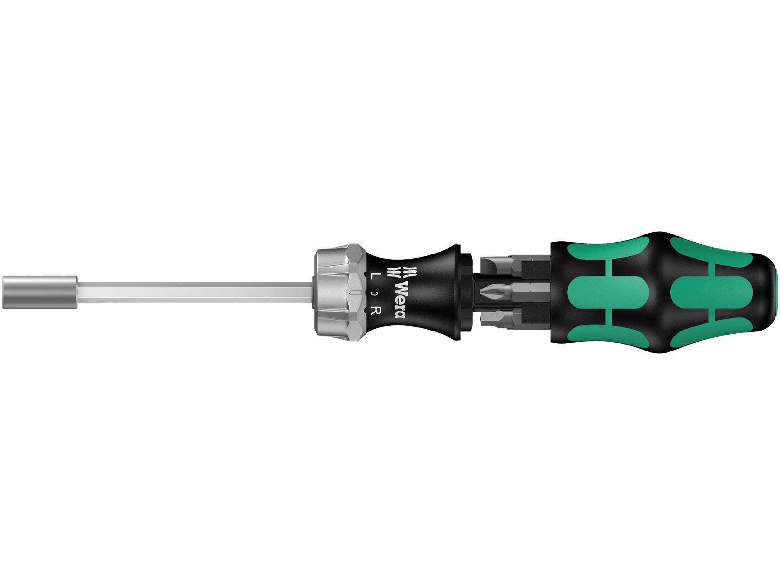 Kompaktværktøj med flerkomponent Kraftform greb til høje arbejdshastigheder og særlig ergonomisk skruning. Integreret bit-magasin i grebet. Inkl. skralde med finfortanding til lille returvinkel, omskifterring (højre, fast, venstre), maksimalt moment på op til 50 Nm, 6kt-klinge med 1/4" indv. 6kt-tilslutning, bøsning i rustfri stål, stærk permanent magnet.