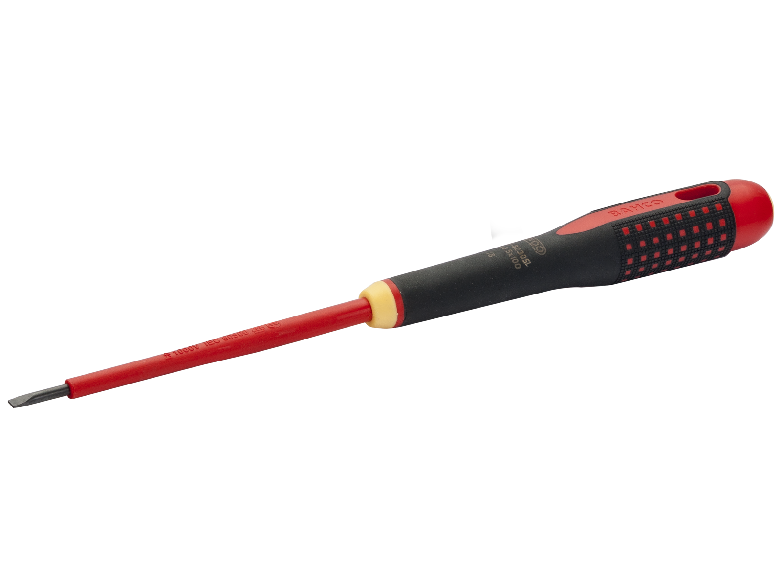 • Skruetrækker Ergo Slim VDE isolerede med 3-komponent håndtag og slanke klinger (reduceret klingediameter). Med fosfateret finish spids, der giver højere nøjagtighed, præcis pasform og ingen afskalning. 3-komponent håndtag til maksimal brugervenlighed, blødt materiale med nubret overflade giver overlegen greb og større kraftoverførsel. Nemt at vælge den rigtige kærv med hjælp fra det farvekodede håndtag og permanente symbol på enden af håndtaget. Med flade sider der forhindrer skruetrækkeren i at rulle. Integreret ophængshul. Højkvalitets klingeisolering, der er støbt direkte på klingen. Klingerne er 30% smallere end de ordinære isolerede klinger, for bedre adgang. Til arbejde under spænding op til 1.000 V. Med følgende standarder: ISO 2380/DIN 5264. Individuelt kontrolleret og fremstillet i henhold til IEC 60900, testet i et vandbad ved 10.000 V. Fås i flere dimensioner og længder.