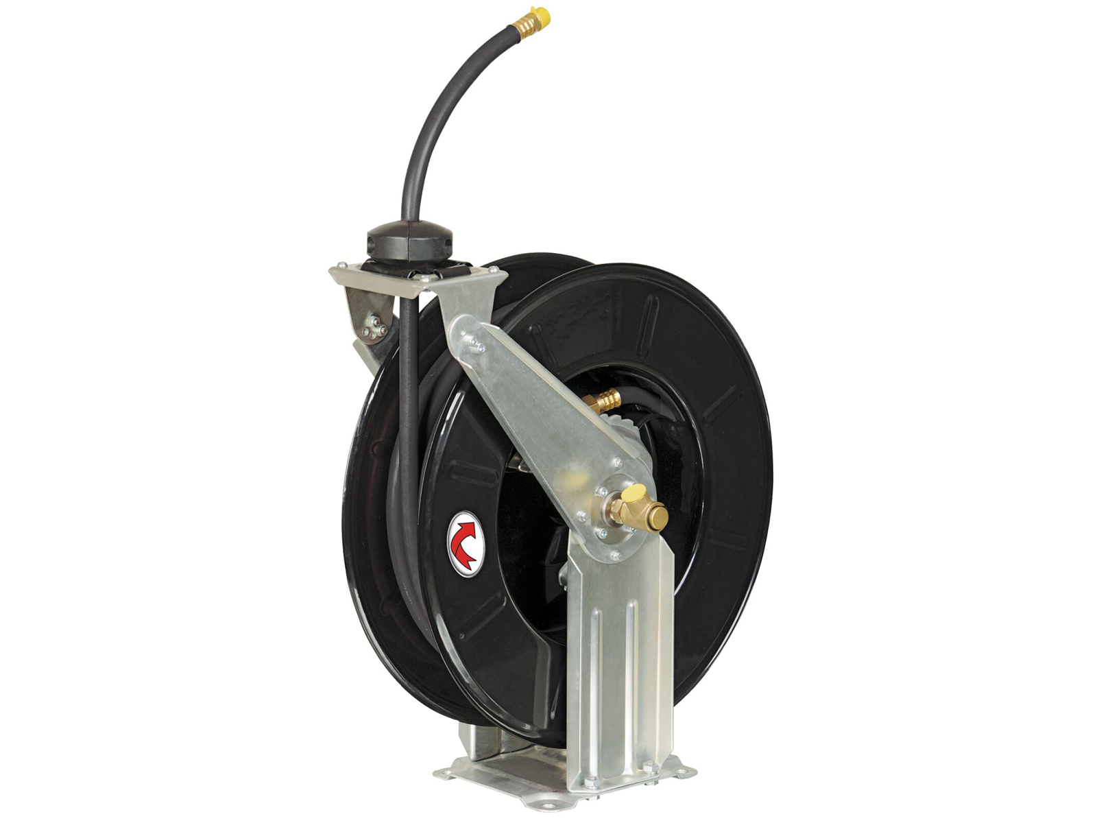 Sortlakeret slangeopruller med 15 m 3/8" 20 bar gummislange, maks. Temperatur 100°C, til både vand og trykluft.