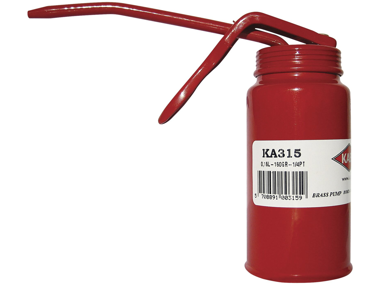 KABI patenteret tryksmørekande med messingpumpe. Beholder: Stål 0,15 ltr. Tud: Stål