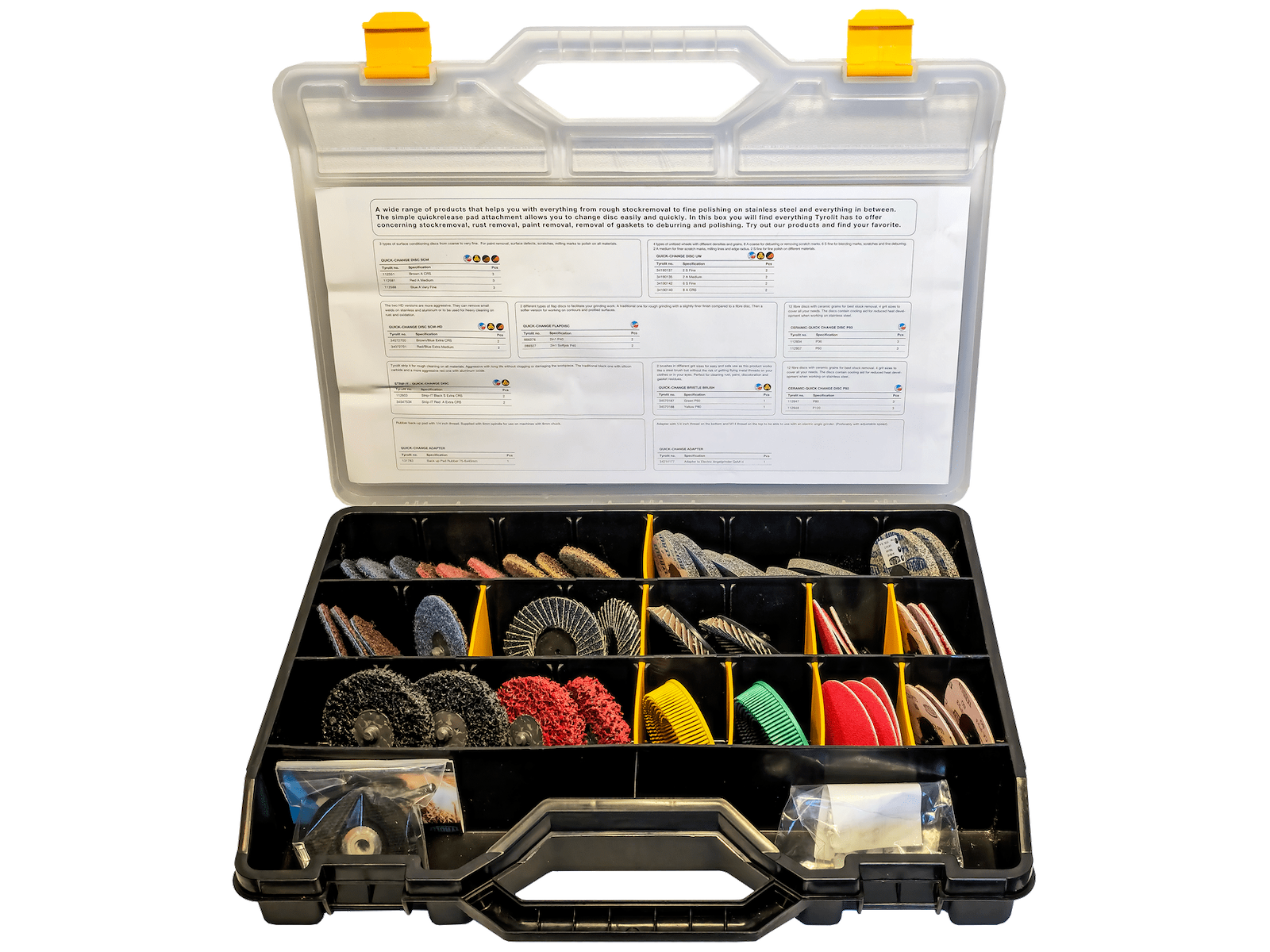 Quick-Change sortimentsboks med et bredt udvalg af produkter til rustfjernelse, fjernelse af maling, afgratning og polering. Det enkle quick-change-system gør det muligt at skifte skiver nemt og hurtigt.