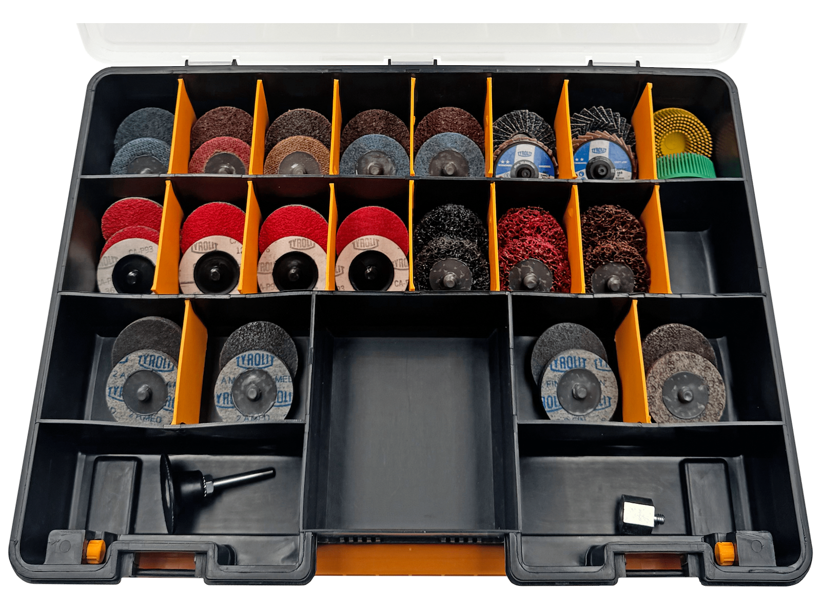 • Sortimentsboks med 47 Quick-Change ø50 mm rondeller. Indhold: Premium SCM rondeller til stål, rustfrit stål, ikke-jernholdige metaller, plast og træ (2× ekstra grov, 3× grov, 2× ekstra medium, 3× medium, 3× meget fin). Premium sammenpressede kompaktskiver til universelle anvendelser (2× grov, 2× medium, 2× fin 2S, 2× fin 6S). Premium Strip-It grovrengøringsskiver til universelle anvendelser (2× ekstra grov, 2× ekstra grov blød, 2× grov). Standard mini-flapdiscs til stål og rustfrit stål (2× korn ZA40). Standard Softjob mini-flapdiscs til stål og rustfrit stål (2× korn ZA40). Premium Sunburst slibebørster til universalbrug (1× ekstra grov, 1× grov). Premium CA-P93 PE Y vliesrondeller til stål og rustfrit stål (3× korn P36, 3× korn P60, 3× korn P80, 3× korn P120). Adapter til montering af Q-Disc-adaptere på en vinkelsliber. Holder til Quick-Change rondeller for nem og sikker montering på minivinkelsliber. Leveres i praktisk sortimentsboks.