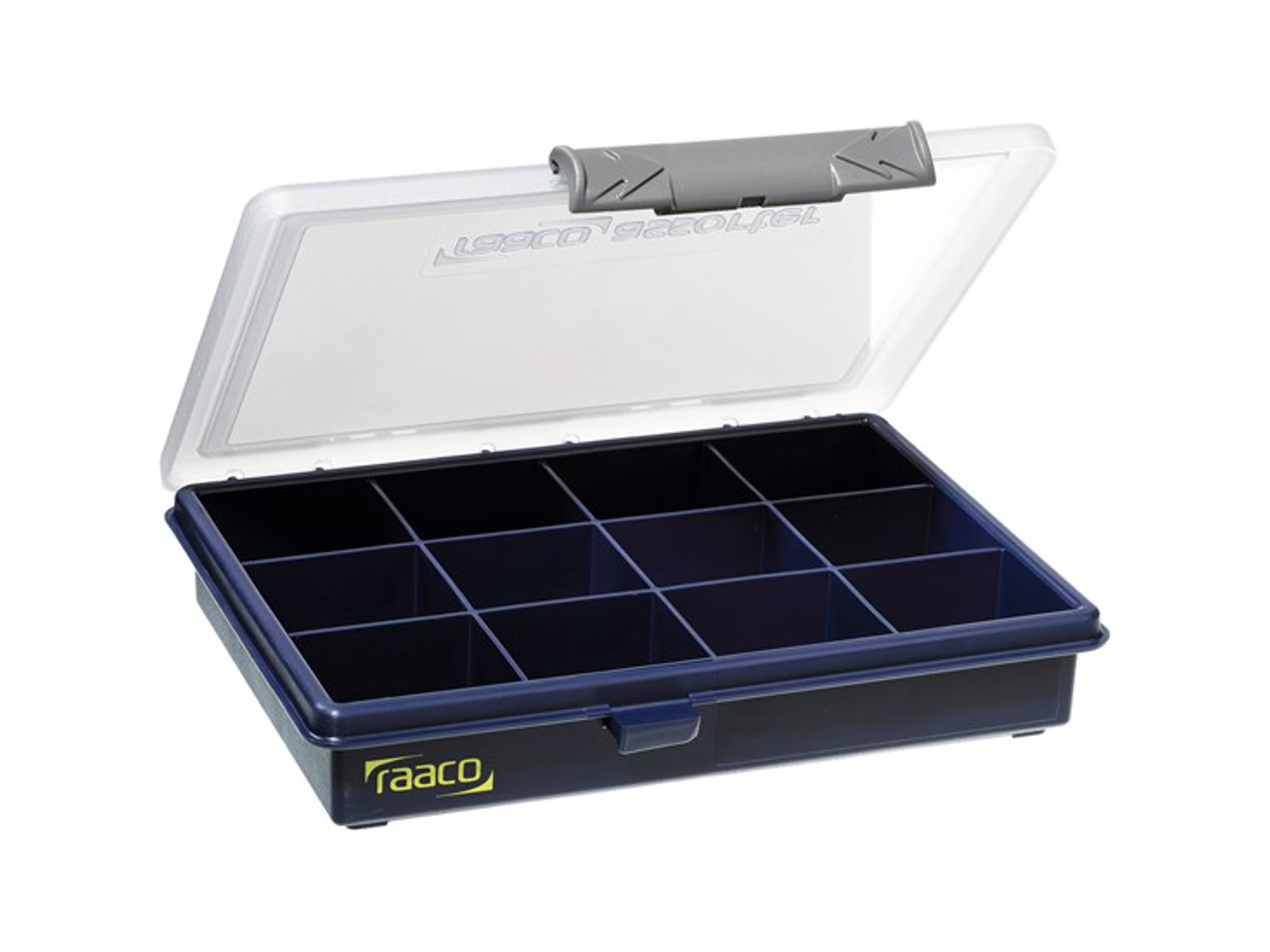 Sortimentsæske med faste rum. Lukkes ved hjælp af skydelås.