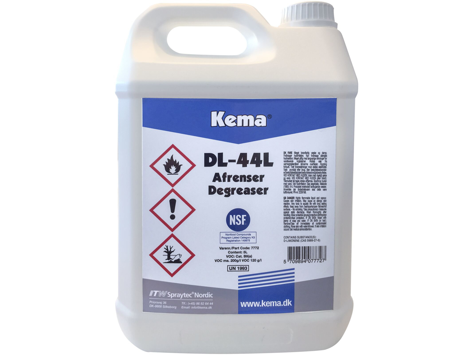 DL-44 er et effektivt industrielt rensemiddel, der opløser fedtstof, olie, snavs/smuds, sod, tryksværte, tusch samt de fleste ikke hærdende klæbestoffer og limrester. DL-44 indeholder intet ætsende, er skånsom og pH-neutral, hvilket gør den velegnet til anvendelse på både glas, metal, laminater, mursten, malede overflader, gummi og træ. Efter ca. 5 minutter er de fleste normalt tørrende klæbestoffer (ikke hærdende typer) neutraliseret og etiket- eller limrester kan fjernes. Egenskaber: etiket fjerner, effektiv affedter, sikker og skånsom, pH-neutral, citrusoliebaseret, bredt anvendelsesområde, fjerner snavs, fedt, olie m.v. Anvendelse: Påfør DL-44 på etiketten eller de emner, der skal løsnes. Lad det trække nogle minutter for at sikre fuldstændig indtrængning, så de aktive citrusolier kan neutralisere bindingsstyrken i limresterne. Fjern det påsatte emne og tør efter med en ren klud. Om nødvendigt kan der skylles efter med vand eller tørres med en fugtig klud. NB! Der bør altid foretages test før brug, da DL-44 kan påvirke visse plasttyper, samt visse special-lakker.