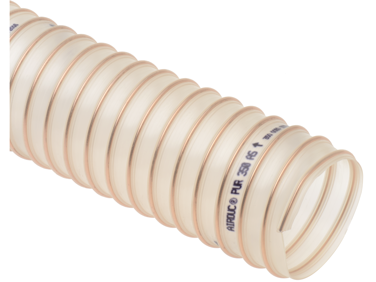 PUR slange med stålspiral PEMPUR 70. Slangen er velegnet til spånsugning, granulatudsugning, kornsugning og istransport. Slangen har en meget stor slidstyrke og rivefasthed. PUR materialet er permanent antistatisk <109 O. Transparant PUR-slange i blød og højfleksibel udførelse med indstøbt stålspiral. Udvendig korrugeret, og glat indvendig. PUR-tykkelse 0,7 mm. Mikrobe bestandig, slidstærk og antistatisk. Brandhæmmende iht. DIN 4102-B1. Indlæg: Fjederstålspiral. Temperatur: -40°C til + 90°C. Kortvarigt op til 125° C. Pris pr. meter. Fås i flere dimensioner.
