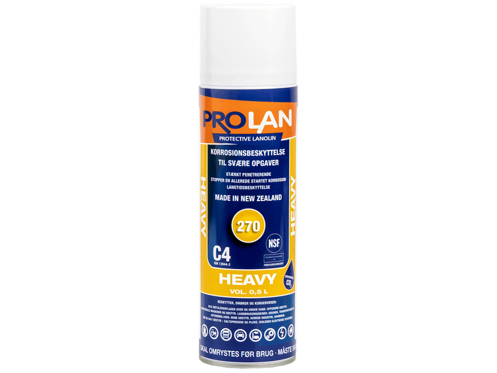 Prolan Heavy er det perfekte middel til svære smørings- og anti-korrosionsopgaver da det penetrerer ind i rust, samlinger og kroge. Anbefales til alle områder, hvor der er stor risiko for en aggressiv korrosion og til beskyttelse af store maskiner fx gravemaskiner, kraner, bobcats, trucks, samt til udstyr opbevaret i lange perioder eller i kontakt med aggressivt eller marint miljø. Desuden er Prolan Heavy meget anvendelig i korrosive miljøer, som ved udmugningsanlæg, gylle, spildevand, syrer, salt, græs og lignende. Produktet kan anvendes til de fleste elektriske installationer, da det er elektrisk adskillende op til 70 kV. Produktet er biologisk nedbrydeligt. Udvaskes og fordamper ikke. Modstår syrer og salte. Lukker overflader hermetisk for ilt. Tåler afvaskning med højtryksrenser. Sikker at anvende på syntetiske materialer, gummi og elektriske systemer. Internationalt fødevaregodkendt til klasse H1, H2 og R2. Indeholder lanolin, blandet med ikke regulerede paraffiner for at lette påføring. Elektrisk adskillende op til 70 kV.
