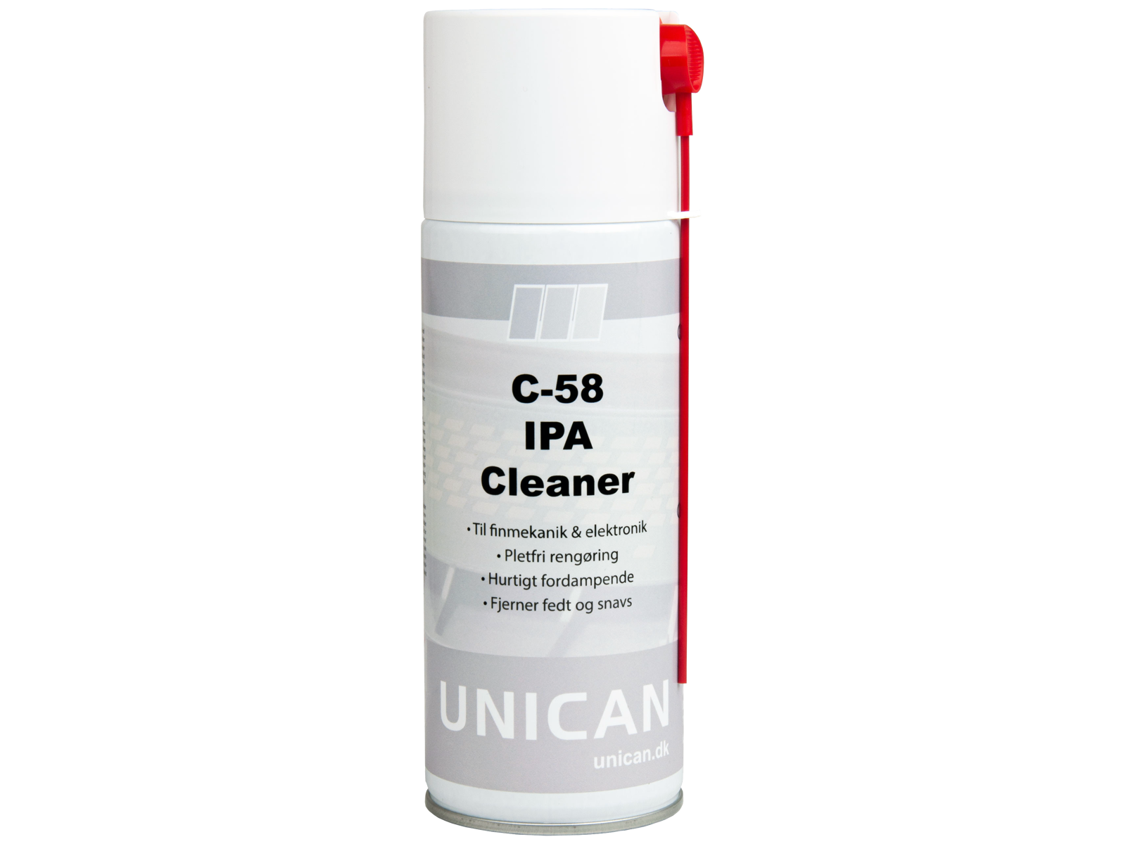 Affedtningsmiddel C-58 IPA Cleaner anvendes ideelt til industriprintere og andet mærkningsudstyr. Sikre rengøring af bevægelige dele, printhoveder samt fjerner blæk og aflejringer. Rengøring af gummiruller eller små gear klares let, da produktet fordamper helt og uden rester efter kort tid. Hærdet smøremiddel og fedtet snavs fjernes målrettet fra mini drev og anden finmekanik. C-58 indeholder 99,7% isopropanol (propanol-2, isopropylalkohol). Efterlader ingen pletter på glasflader eller blankt metal. C-58 er skånsom mod de fleste materialer. Ideelt til rengøring af plastoverflader før lakering/grunding eller påføring af klæbemasse. Kan bruges som for-rens ved folieindpakning af køretøjer eller som en inspektionsspray ved køretøjsvedligeholdelse (polering). Til optiske linser, spejle, men ikke til plastiklinser og plastiske spejle. Bør altid testes før brug. Kan påvirke/fjerne anti-statiske/-reflex belægninger samt påvirke visse plexiglas typer.