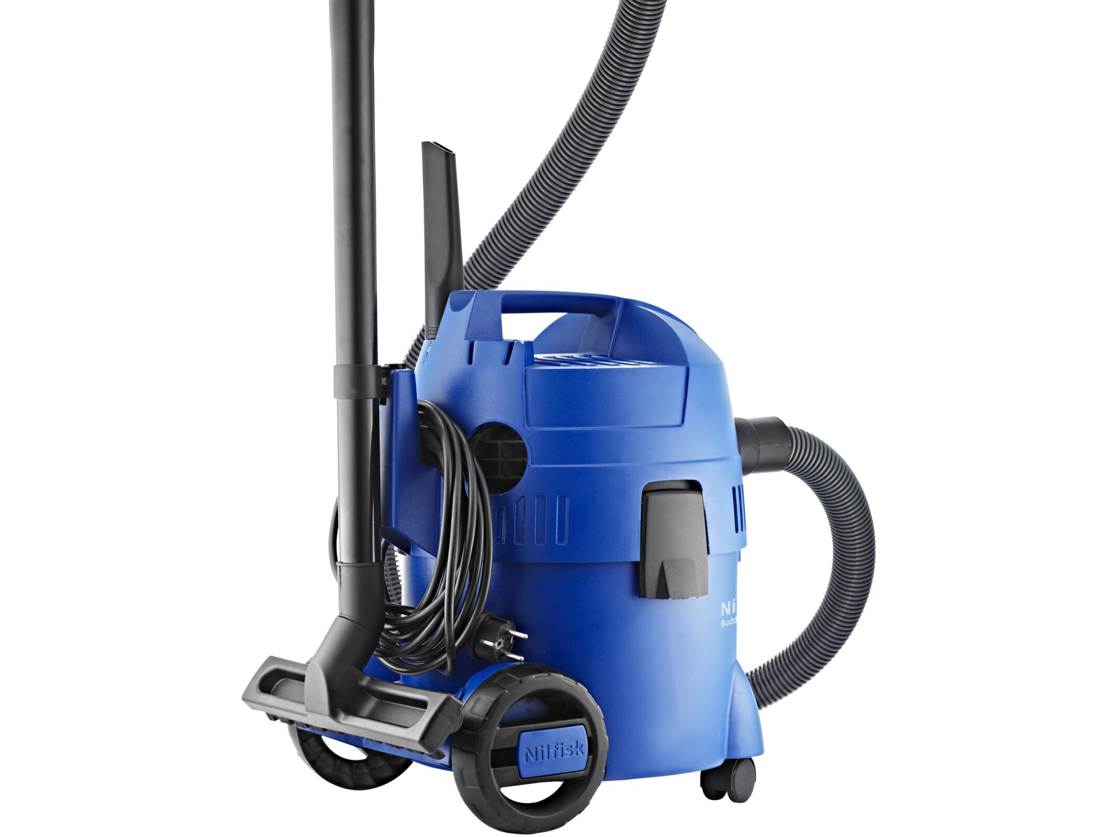 Støvsugeren står stabilt med to store hjul bagpå og to roterende hjul foran, hvilket giver god manøvredygtighed under rengøringen. Det medfølgende standard våd- og tørfilter beskytter motoren og bidrager til en lang levetid, og den indbyggede tilbehørsholder sørger for, at mundstykkerne altid er lige ved hånden.