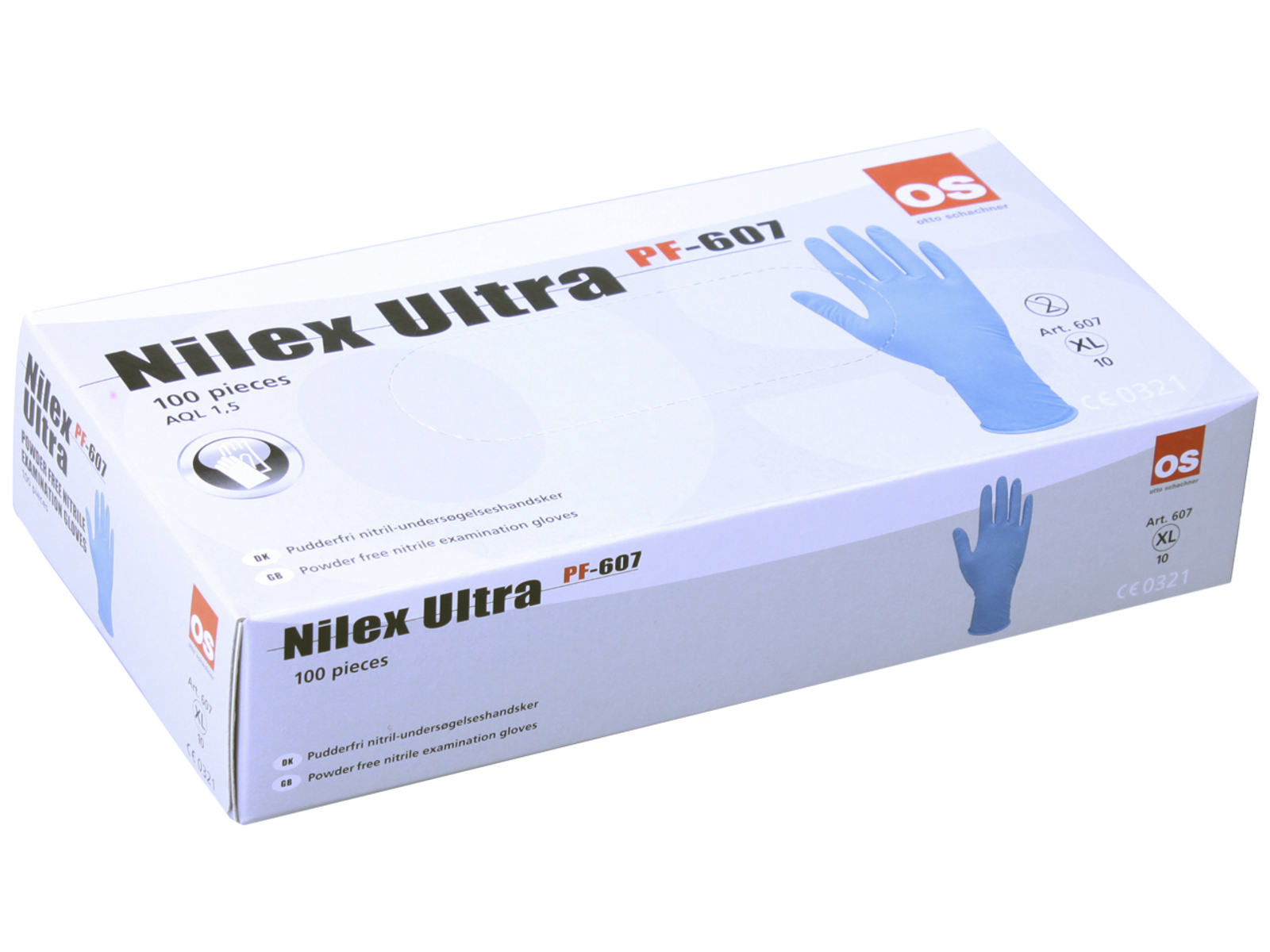 Pudderfri nitrilhandske med rullet kant, glat overflade og prægede fingerspidser. Ekstra tynd, blå design med 0,05 mm tykkelse. Ideel til fødevareproduktion, montage, produktkontrol, laboratoriearbejde, kemisk industri og lettere rengøring. Æske med 100 stk. Godkendelser: EN ISO 374-1:2016/type B, EN ISO 374-5:2016, EN 455 og EN 420:2003+A1:2009. Fødevaregodkendt. Kategori III. AQL 1,5.