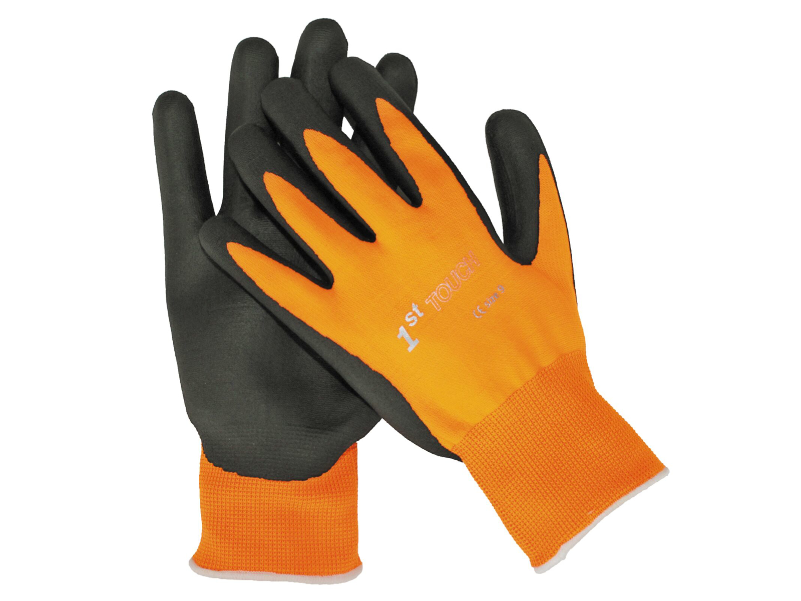 Handske af tynd nylonstrik med ribkrave i Hi-Viz orange farve. Håndfladebelægning af Foam Nitril. Handsken er ”Touch-skærm”-følsom i tre fingre.