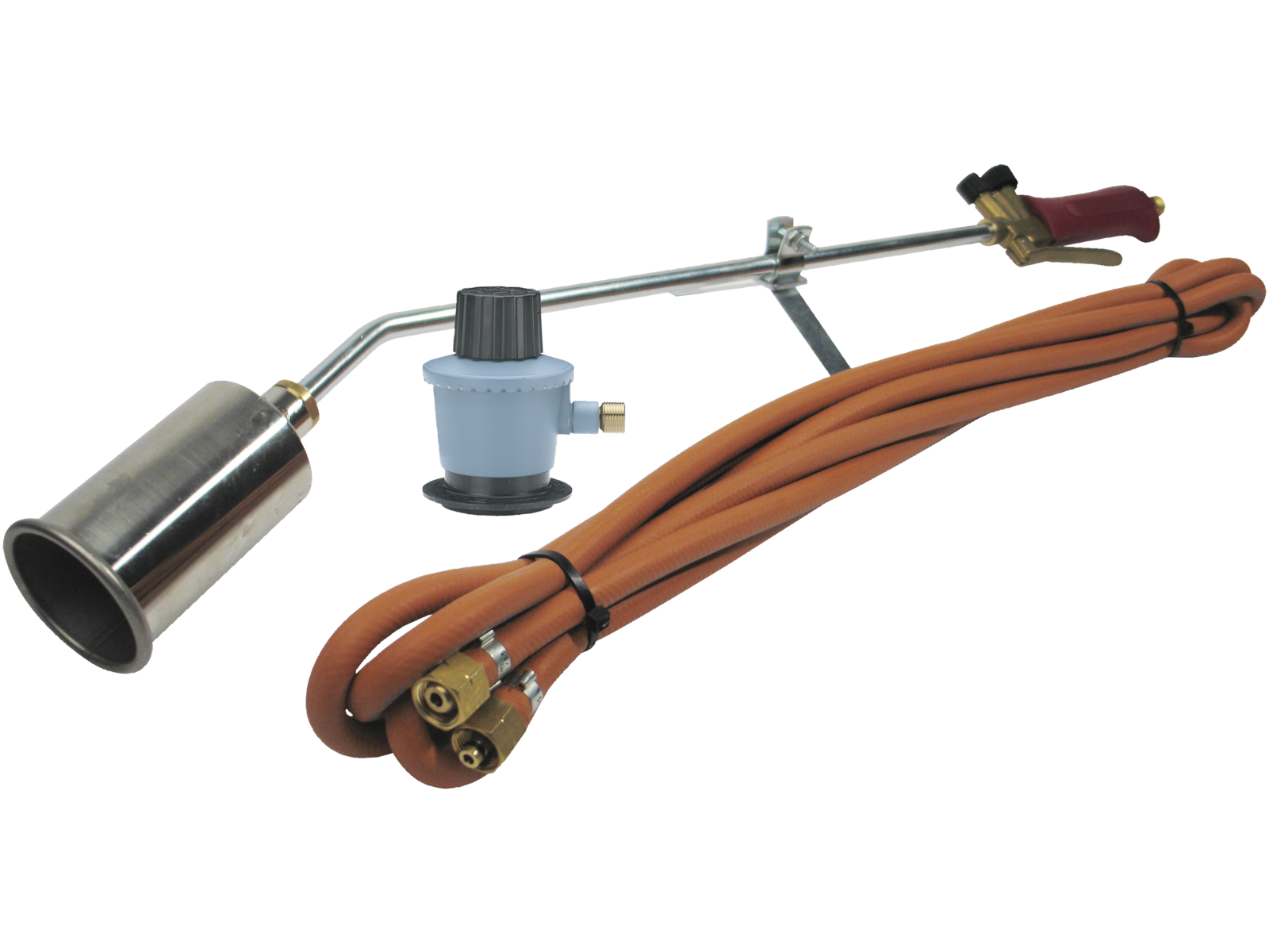 Tagbrændersæt bestående af håndtag med spareventil, 500 mm halsrør og 60 mm stormbrænder, højtryksregulator 0-2 bar, click-on, og 5 m højtryksslange med fittings.
