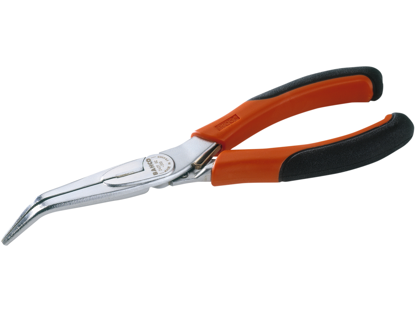 Spidstang med bukket spids 45° udviklet i henhold til Bahco ERGO™ program. ISO 5745. Forkromet, rustbeskyttet. Højtlegeret stål. ERGO™ to-komponent håndtag med store grebsflader. Lange, halvcirkelformede kæber med tværriflede gribeflader. Nøjagtige og hærdede skær for klipning af blødere materialer som kobber og plastisolerede kabler. Afrundede kæber som gør tangen velegnet, hvor pladsen er trang. Forsynet med returfjeder med on/off funktion.