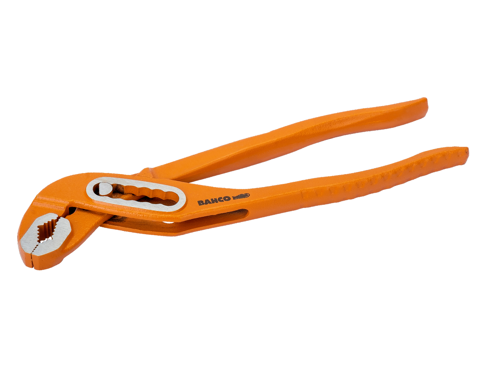 Vandpumpetang med parallelle, induktions hærdede og slebne kæber. ISO 8976. Orange lakeret. Højtlegeret stål. Gennemstukne og nøjagtigt bearbejdede led.