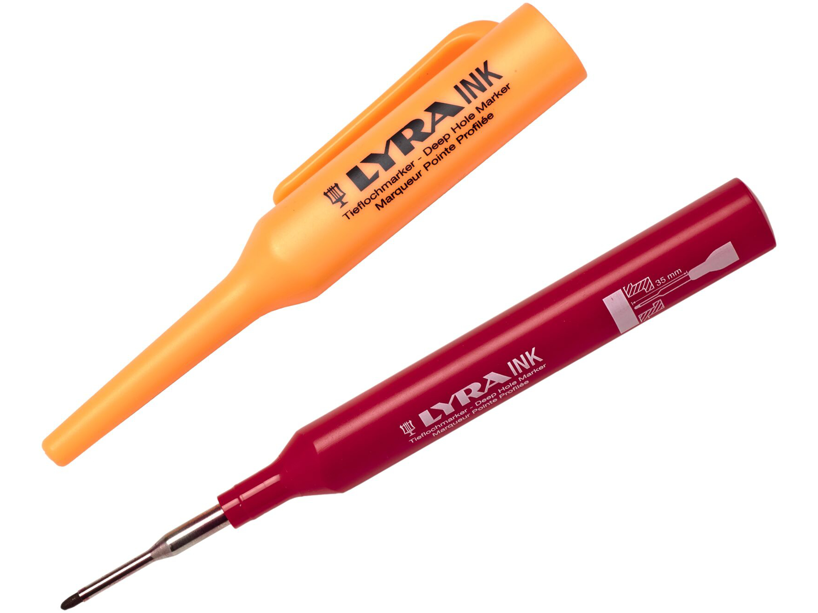 Lyra dybhulsmarkør. Velegnet til utilgængelige steder, forlænget pennespids i rustfri stål. Permanent, vandfast.