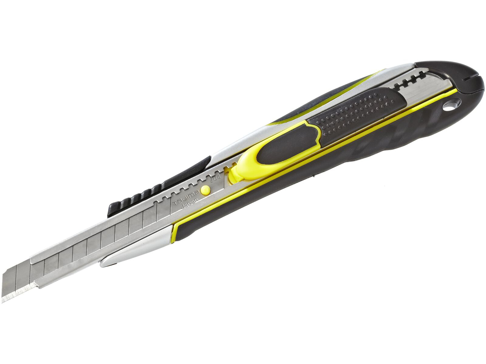2i1 9 mm hobbykniv med sikkerhedssystem samt autolås. Slank design lavet af zink legering med blødt håndtag, som medfører komfortabel håndtering. Med venstre knap for sikkerhedskniv, hvor klingen selv går tilbage, når skyderen slippes. Med højre knap for fast autolås med 25 kg's tryklås. Endebeskyttelse i kniven er forsynet med slids til afbrækning af klingesegmenter.