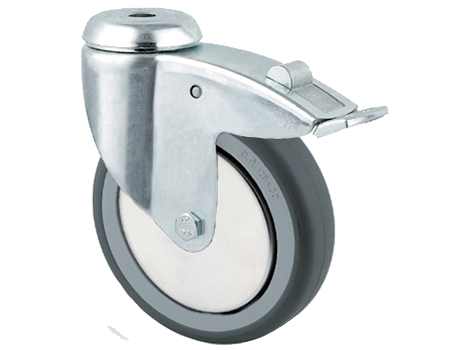 Drejeligt hjul med bremse, 75 mm, grå gummi, glideleje, bolthul, 75 kg