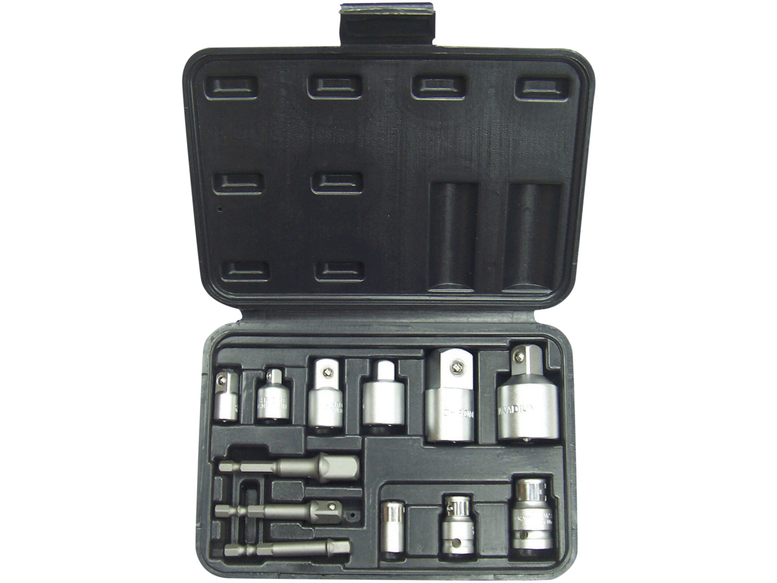 Adaptersæt kpl. B-AD1385 12 dele. 1/4"Fx3/8"m. - 3/8"Fx1/4"M. - 3/8"Fx1/2"M. - 1/2"Fx3/8"M. - 1/2"Fx3/4"M. - 3/4"Fx1/2"M, topholder 1/4" 3/8" 1/2", bitsholder 1/4"x1/4" - 3/8"x5/16" - 1/2"x3/8". Plastbox.