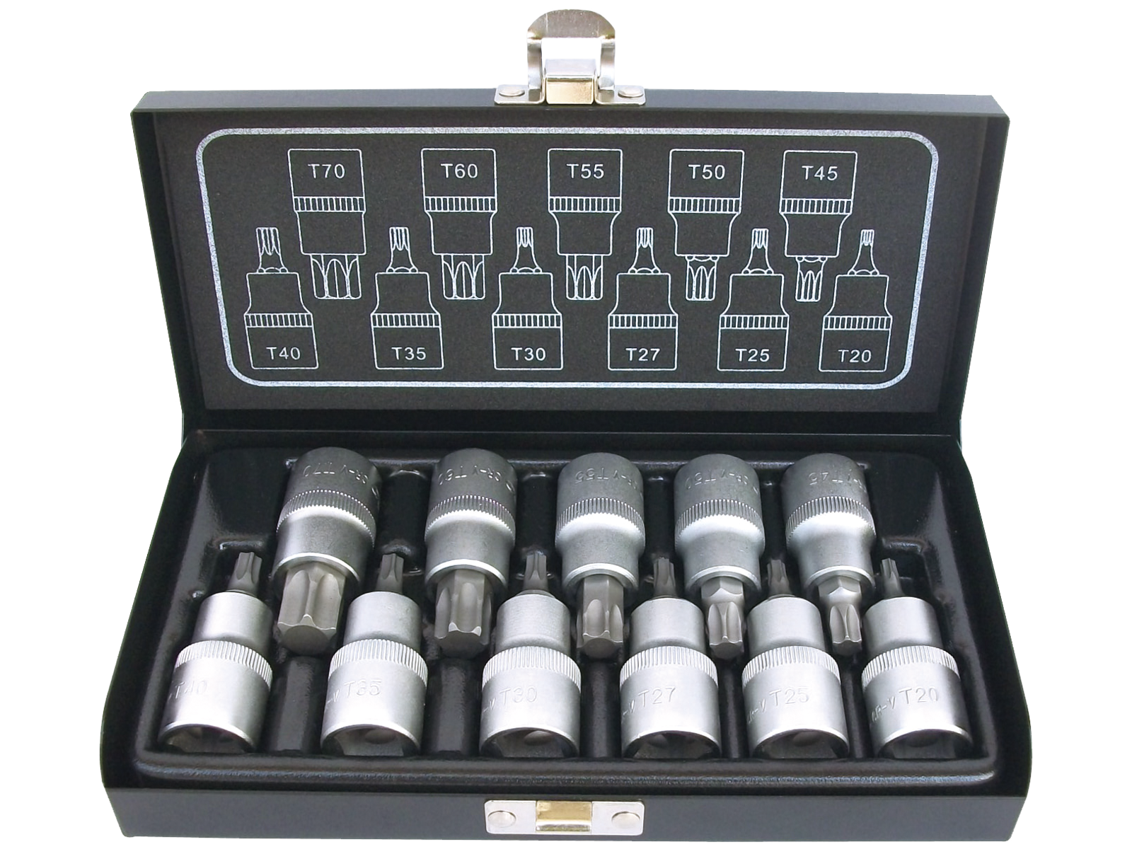 Stifttopsæt med 11 dele. Indeholder korte (55 mm) 1/2" 4kt Torx-stifttoppe i størrelserne TX 20-25-27-30-35-40-45-50-55-60-70. Leveres i metalboks.